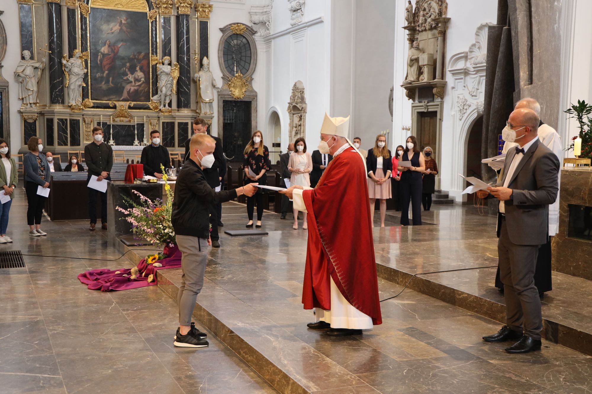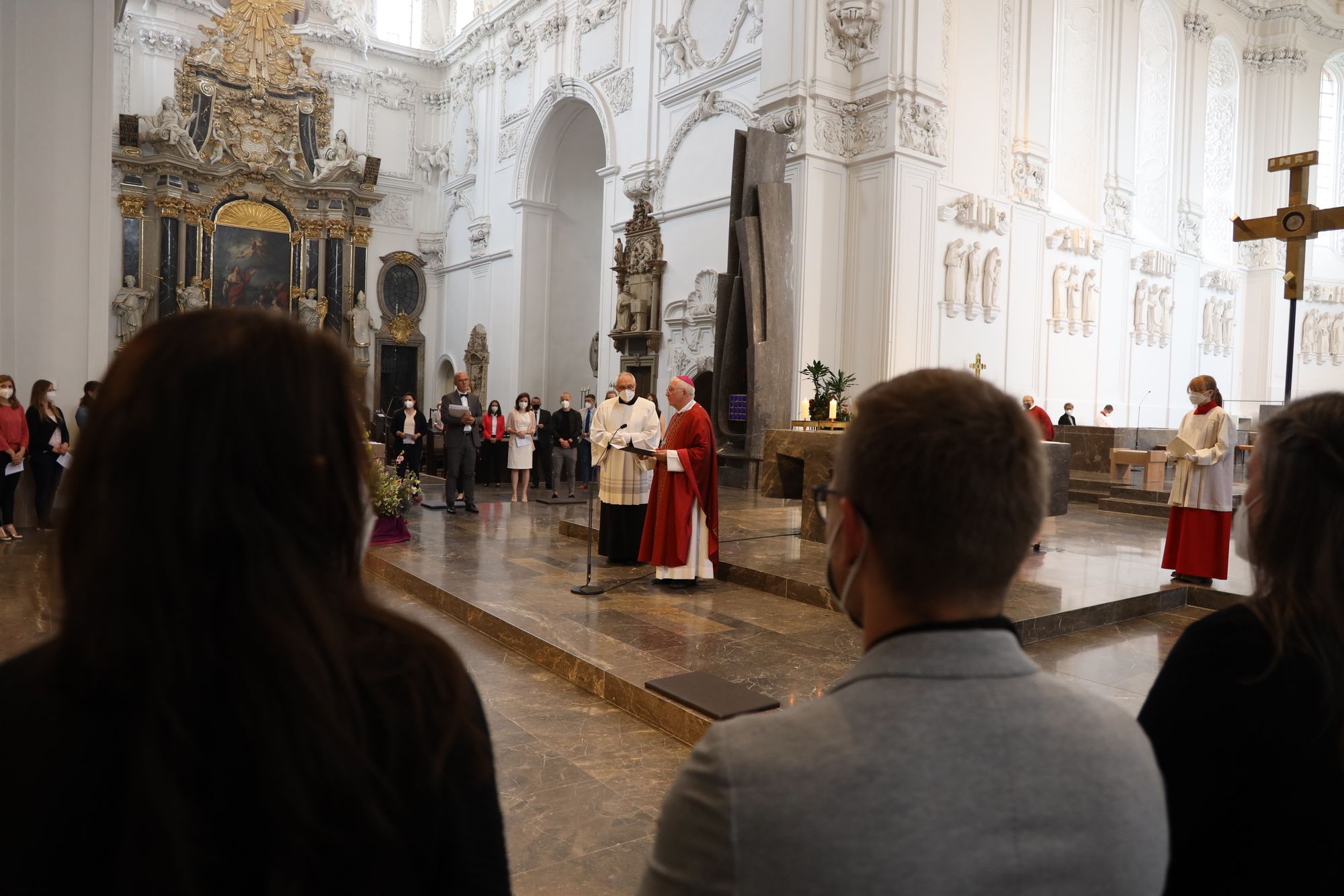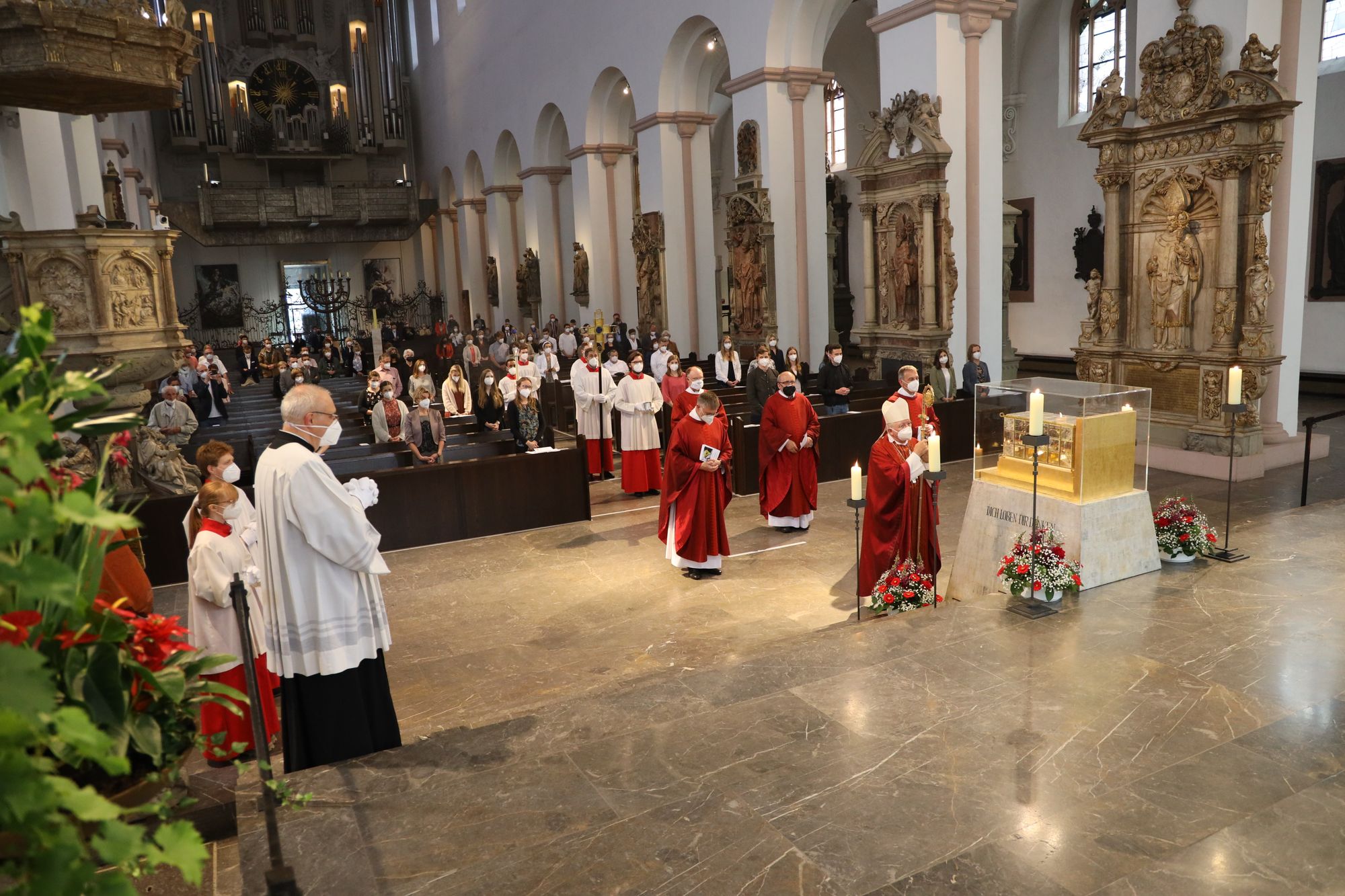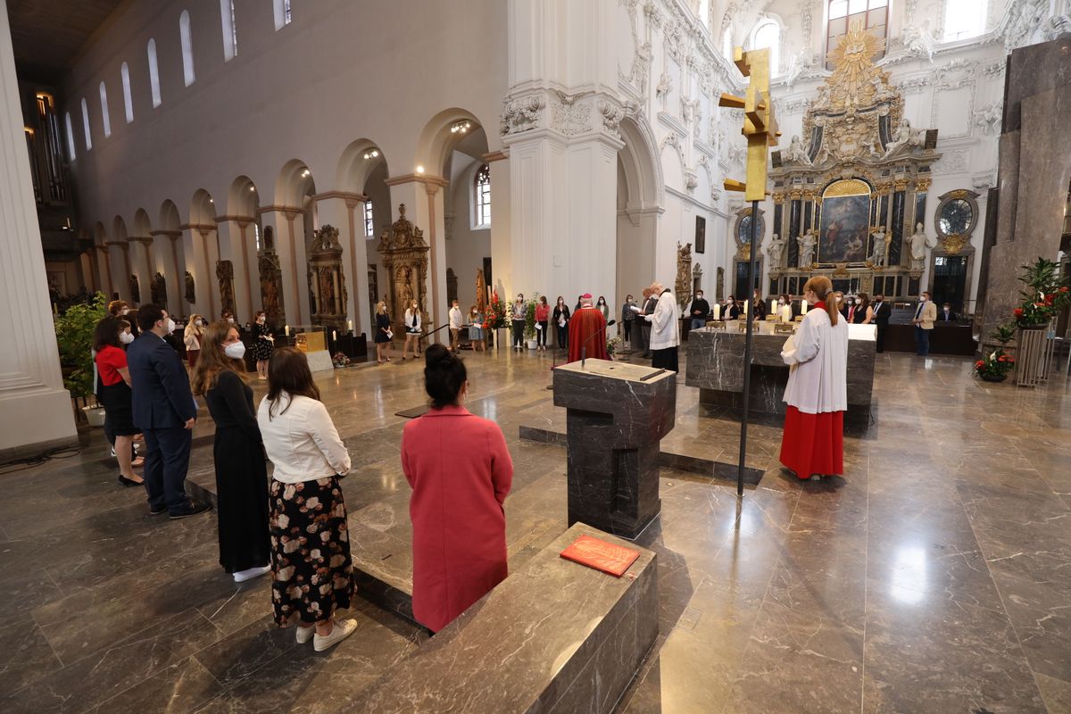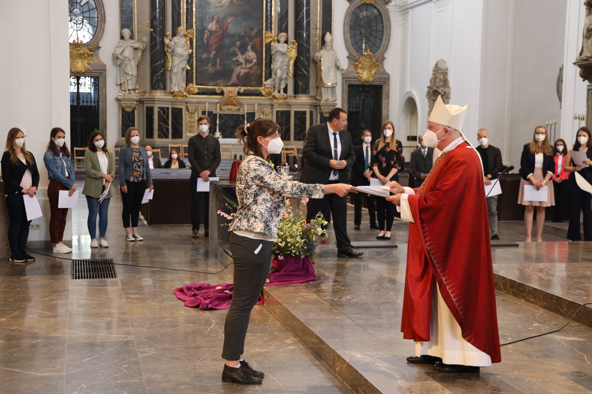 Würzburg (POW) 33 Frauen und sieben Männern hat Weihbischof Ulrich Boom im Auftrag von Bischof Dr. Franz Jung am Freitagabend, 9. Juli, beim Kiliani-Tag der Verantwortlichen in Schule und Erziehung die Missio canonica verliehen. Bei einer Eucharistiefeier unter den aktuellen Coronaschutzvorschriften mit rund 120 Gläubigen im Kiliansdom erklärte der Weihbischof, die Frankenapostel Kilian, Kolonat und Totnan seien wie die Menschen in der aktuellen Coronapandemie mit Sorgen und Nöten konfrontiert gewesen. Aber sie hätten ein tiefes Vertrauen gehabt, das sich auf sie selbst, die Gemeinschaft und nicht zuletzt auf Gott gegründet habe. „In Jesus Christus hat Gott uns gezeigt, wie nahe er uns ist in unserem Leben und Sterben, in unseren Unsicherheiten und Ängsten.“ Insofern seien die Frankenapostel Vorbilder und Helfer, „sowohl im Blick auf die globale Krise, verursacht durch den Coronavirus, als auch auf die noch tiefer sitzende Verunsicherung durch den Virus des Misstrauens“. Gemeinsam mit Leitendem Schulamtsdirektor i. K. Jürgen Engel, Leiter der Abteilung Schule und Hochschule, übergab der Weihbischof den neuen Religionslehrern dieses Schuljahres die Beauftragungsurkunden. Pandemiebedingt musste die Begegnung nach dem Gottesdienst entfallen.