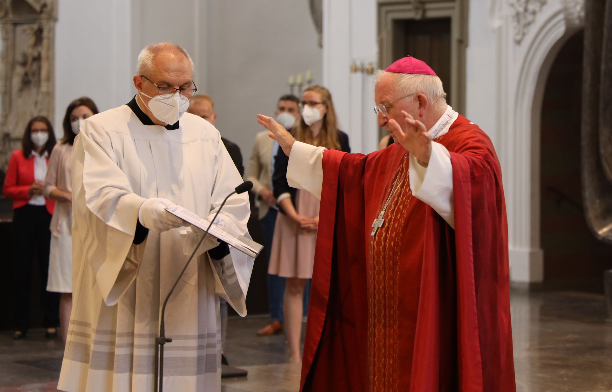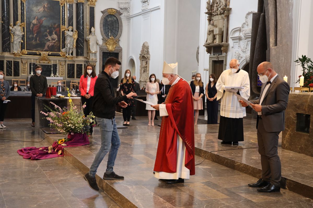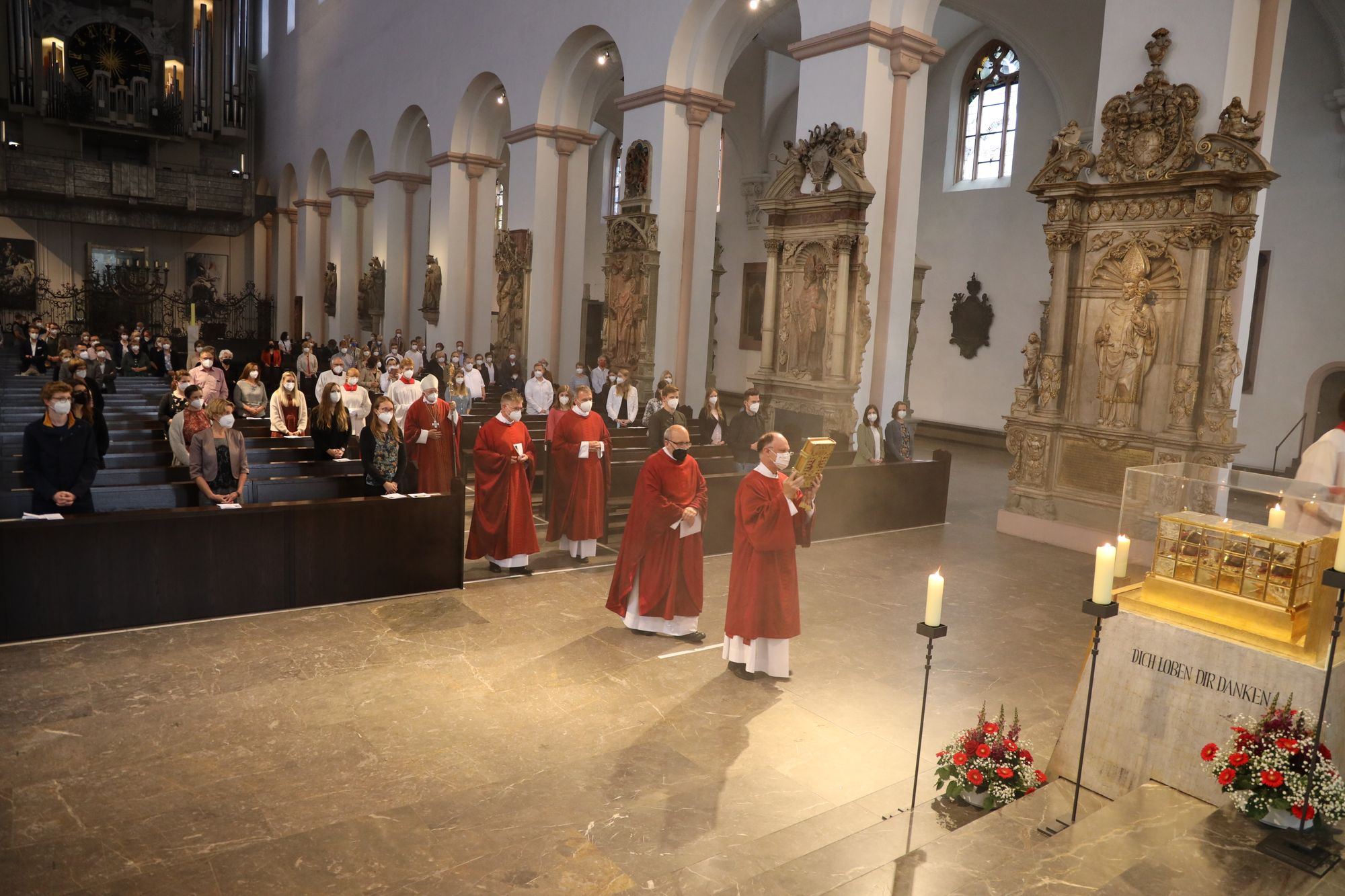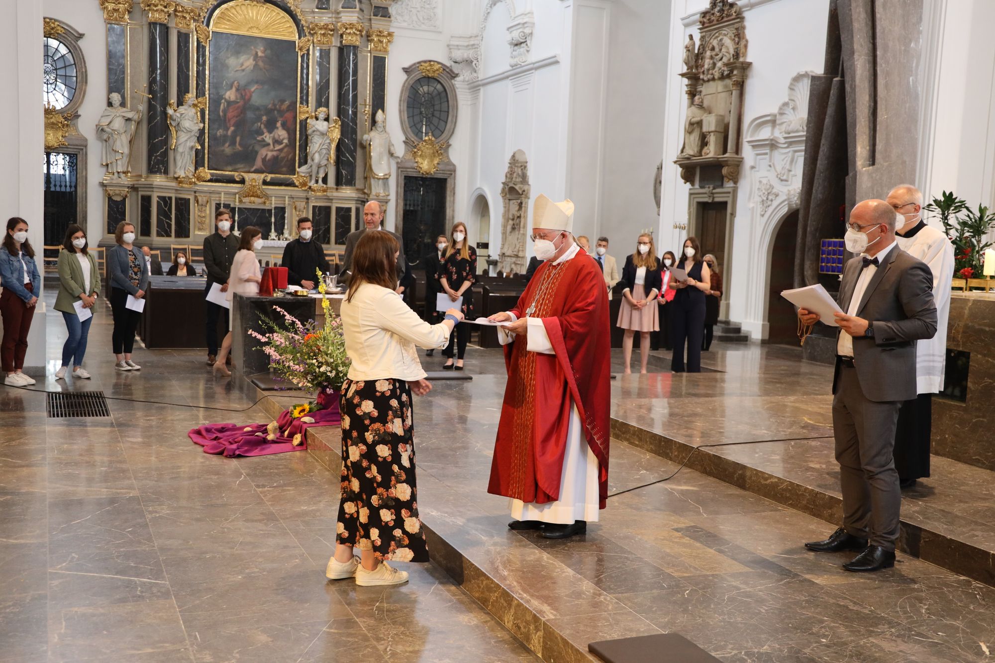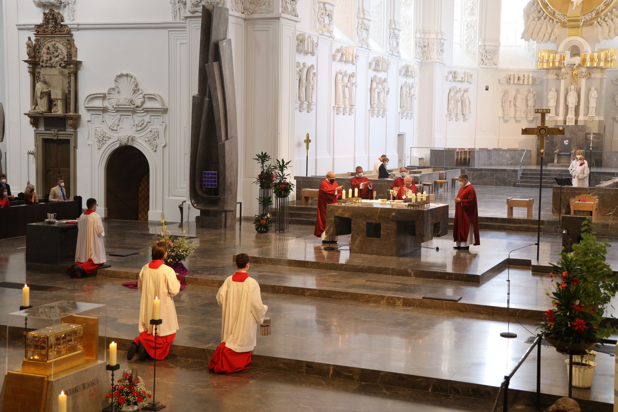 Würzburg (POW) 33 Frauen und sieben Männern hat Weihbischof Ulrich Boom im Auftrag von Bischof Dr. Franz Jung am Freitagabend, 9. Juli, beim Kiliani-Tag der Verantwortlichen in Schule und Erziehung die Missio canonica verliehen. Bei einer Eucharistiefeier unter den aktuellen Coronaschutzvorschriften mit rund 120 Gläubigen im Kiliansdom erklärte der Weihbischof, die Frankenapostel Kilian, Kolonat und Totnan seien wie die Menschen in der aktuellen Coronapandemie mit Sorgen und Nöten konfrontiert gewesen. Aber sie hätten ein tiefes Vertrauen gehabt, das sich auf sie selbst, die Gemeinschaft und nicht zuletzt auf Gott gegründet habe. „In Jesus Christus hat Gott uns gezeigt, wie nahe er uns ist in unserem Leben und Sterben, in unseren Unsicherheiten und Ängsten.“ Insofern seien die Frankenapostel Vorbilder und Helfer, „sowohl im Blick auf die globale Krise, verursacht durch den Coronavirus, als auch auf die noch tiefer sitzende Verunsicherung durch den Virus des Misstrauens“. Gemeinsam mit Leitendem Schulamtsdirektor i. K. Jürgen Engel, Leiter der Abteilung Schule und Hochschule, übergab der Weihbischof den neuen Religionslehrern dieses Schuljahres die Beauftragungsurkunden. Pandemiebedingt musste die Begegnung nach dem Gottesdienst entfallen.