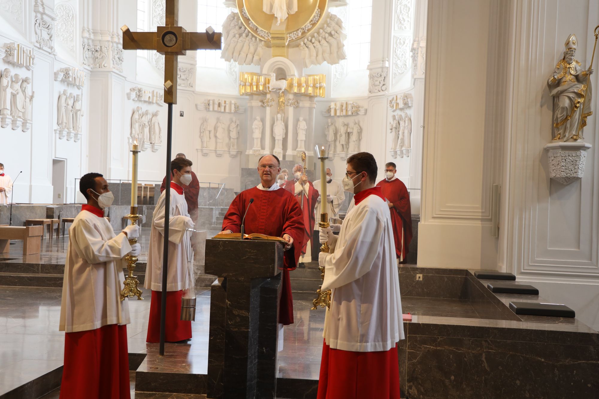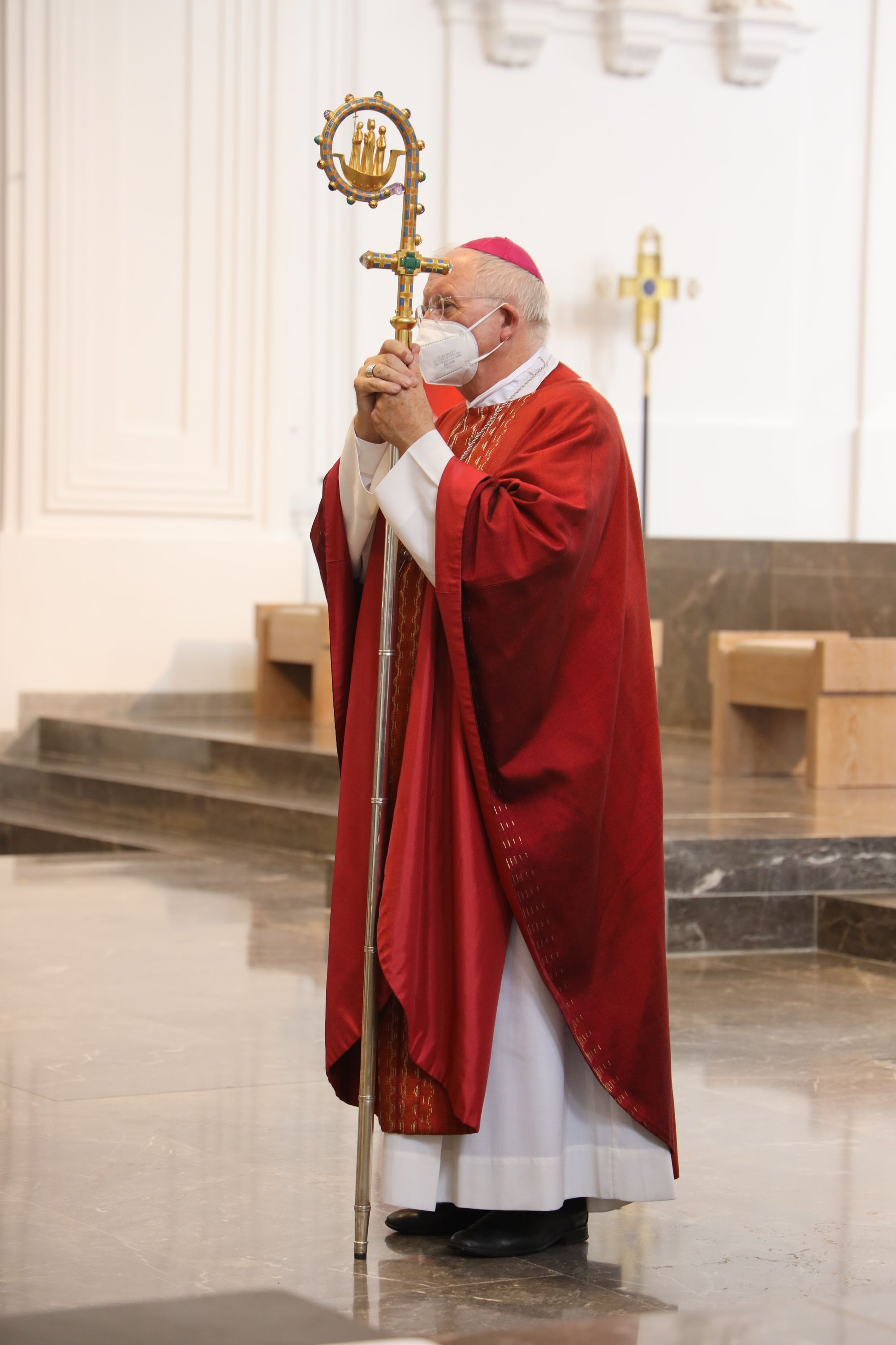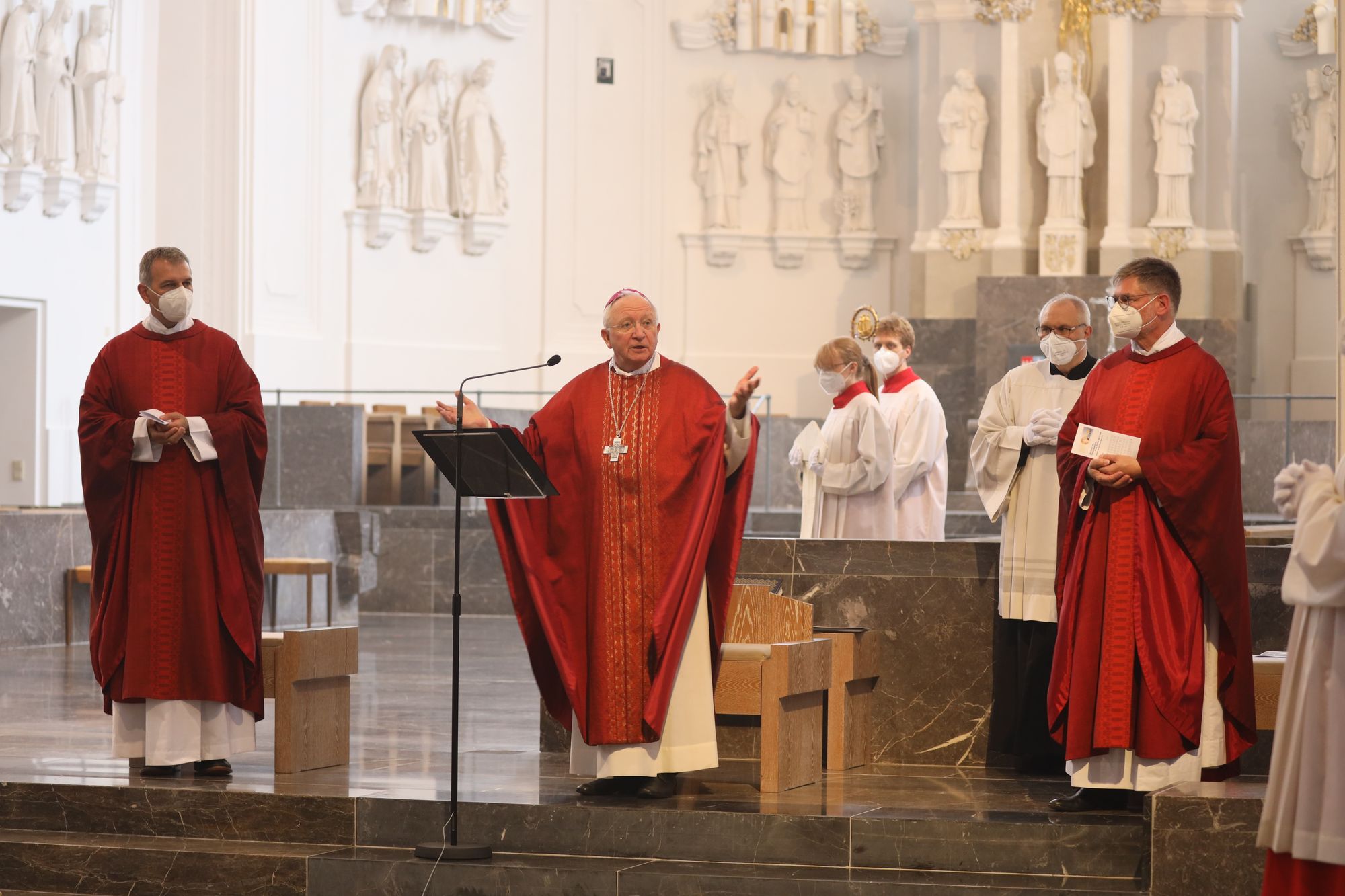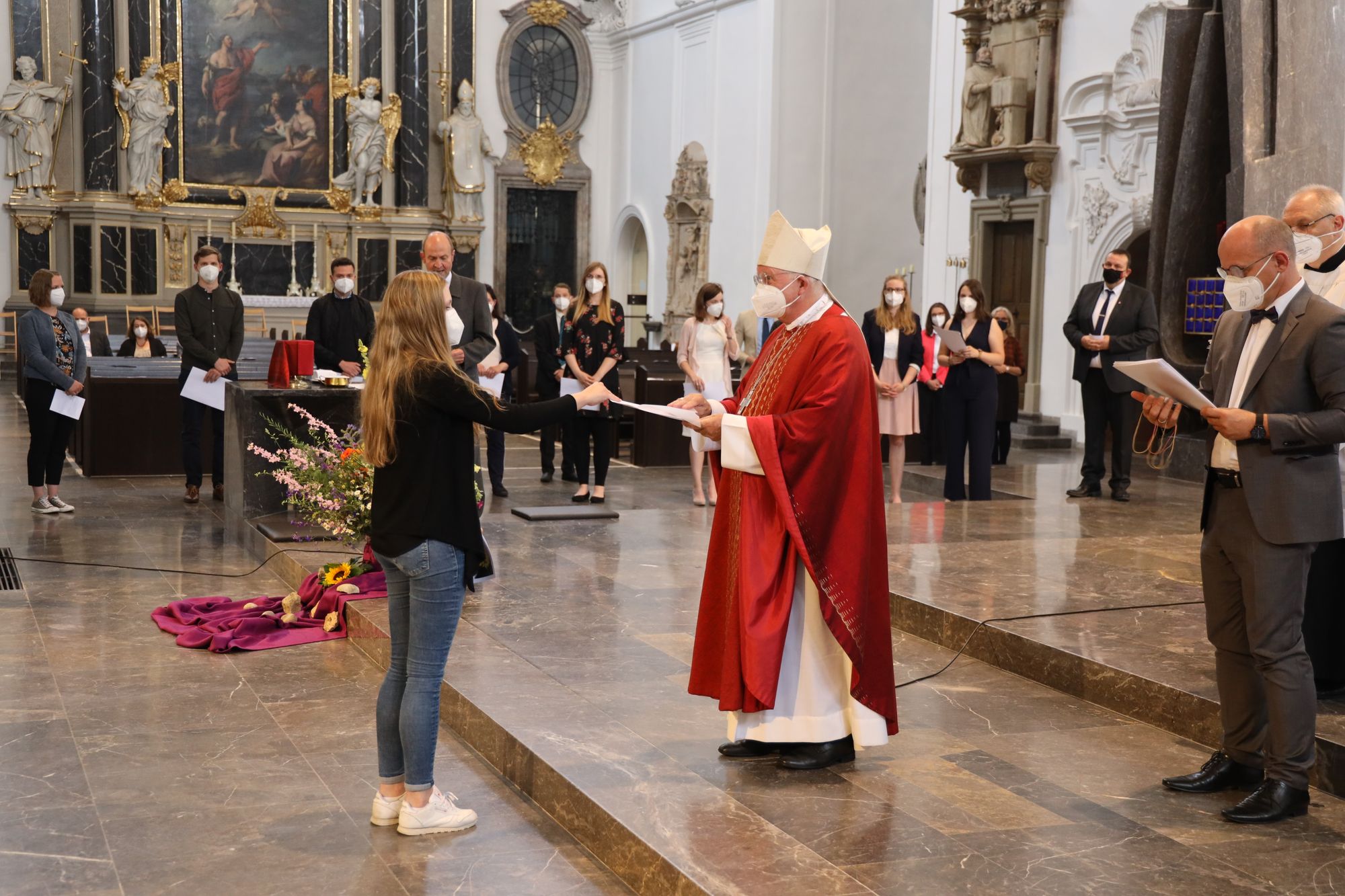 Würzburg (POW) 33 Frauen und sieben Männern hat Weihbischof Ulrich Boom im Auftrag von Bischof Dr. Franz Jung am Freitagabend, 9. Juli, beim Kiliani-Tag der Verantwortlichen in Schule und Erziehung die Missio canonica verliehen. Bei einer Eucharistiefeier unter den aktuellen Coronaschutzvorschriften mit rund 120 Gläubigen im Kiliansdom erklärte der Weihbischof, die Frankenapostel Kilian, Kolonat und Totnan seien wie die Menschen in der aktuellen Coronapandemie mit Sorgen und Nöten konfrontiert gewesen. Aber sie hätten ein tiefes Vertrauen gehabt, das sich auf sie selbst, die Gemeinschaft und nicht zuletzt auf Gott gegründet habe. „In Jesus Christus hat Gott uns gezeigt, wie nahe er uns ist in unserem Leben und Sterben, in unseren Unsicherheiten und Ängsten.“ Insofern seien die Frankenapostel Vorbilder und Helfer, „sowohl im Blick auf die globale Krise, verursacht durch den Coronavirus, als auch auf die noch tiefer sitzende Verunsicherung durch den Virus des Misstrauens“. Gemeinsam mit Leitendem Schulamtsdirektor i. K. Jürgen Engel, Leiter der Abteilung Schule und Hochschule, übergab der Weihbischof den neuen Religionslehrern dieses Schuljahres die Beauftragungsurkunden. Pandemiebedingt musste die Begegnung nach dem Gottesdienst entfallen.