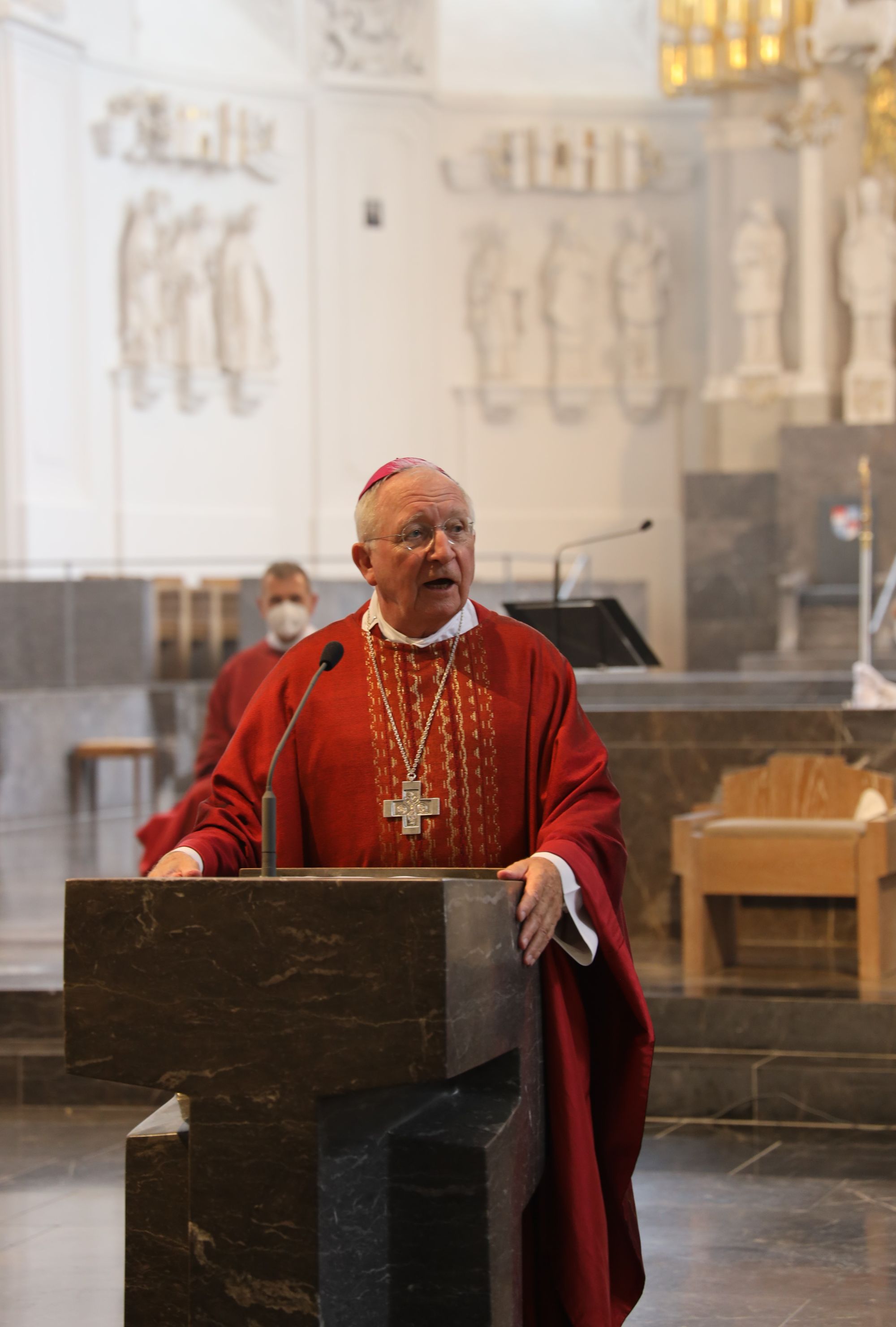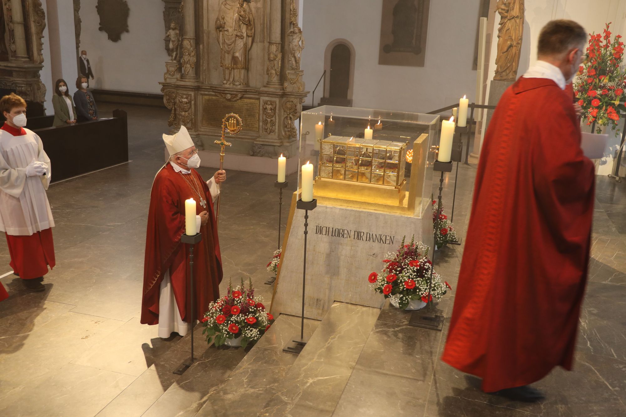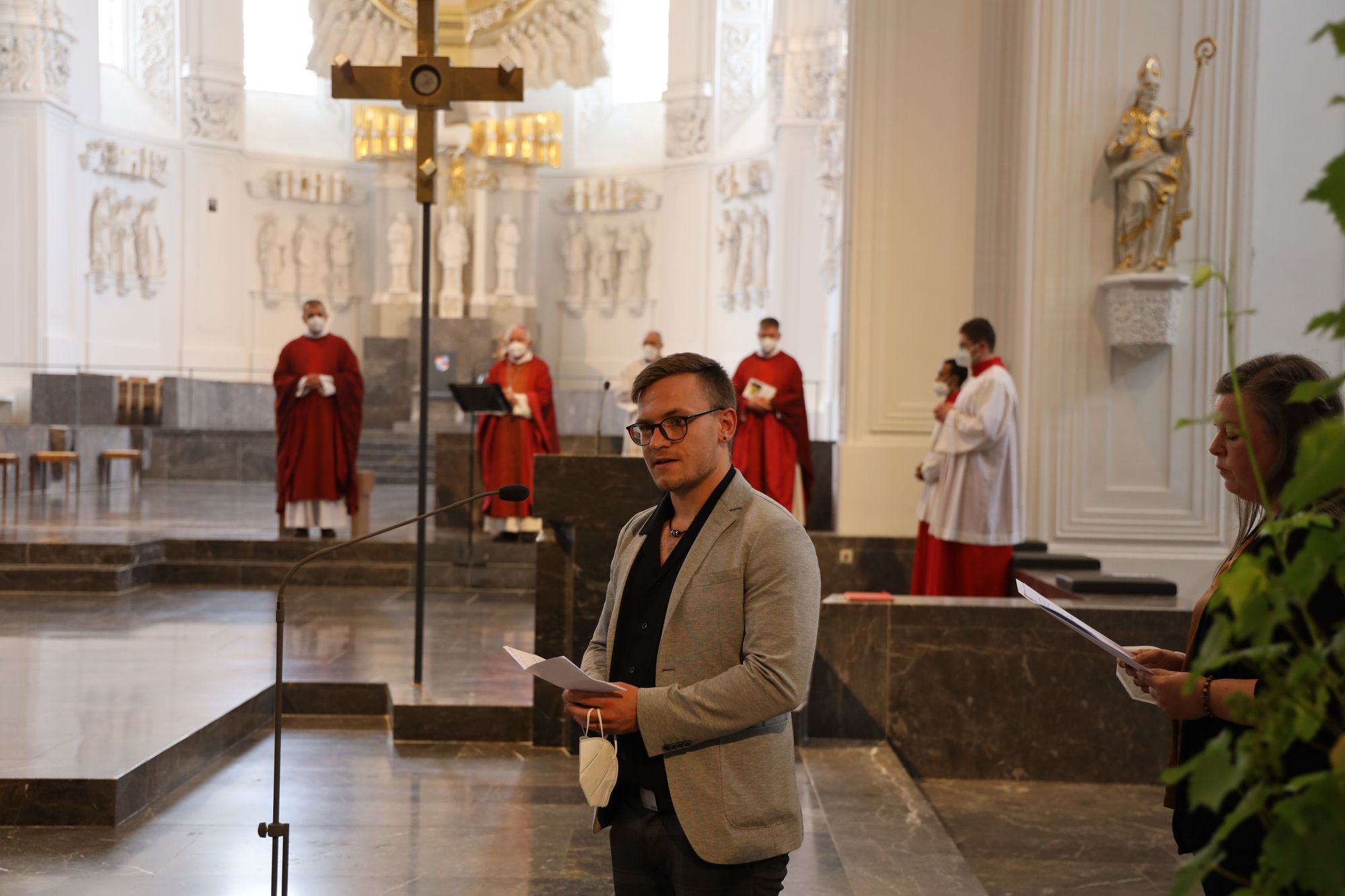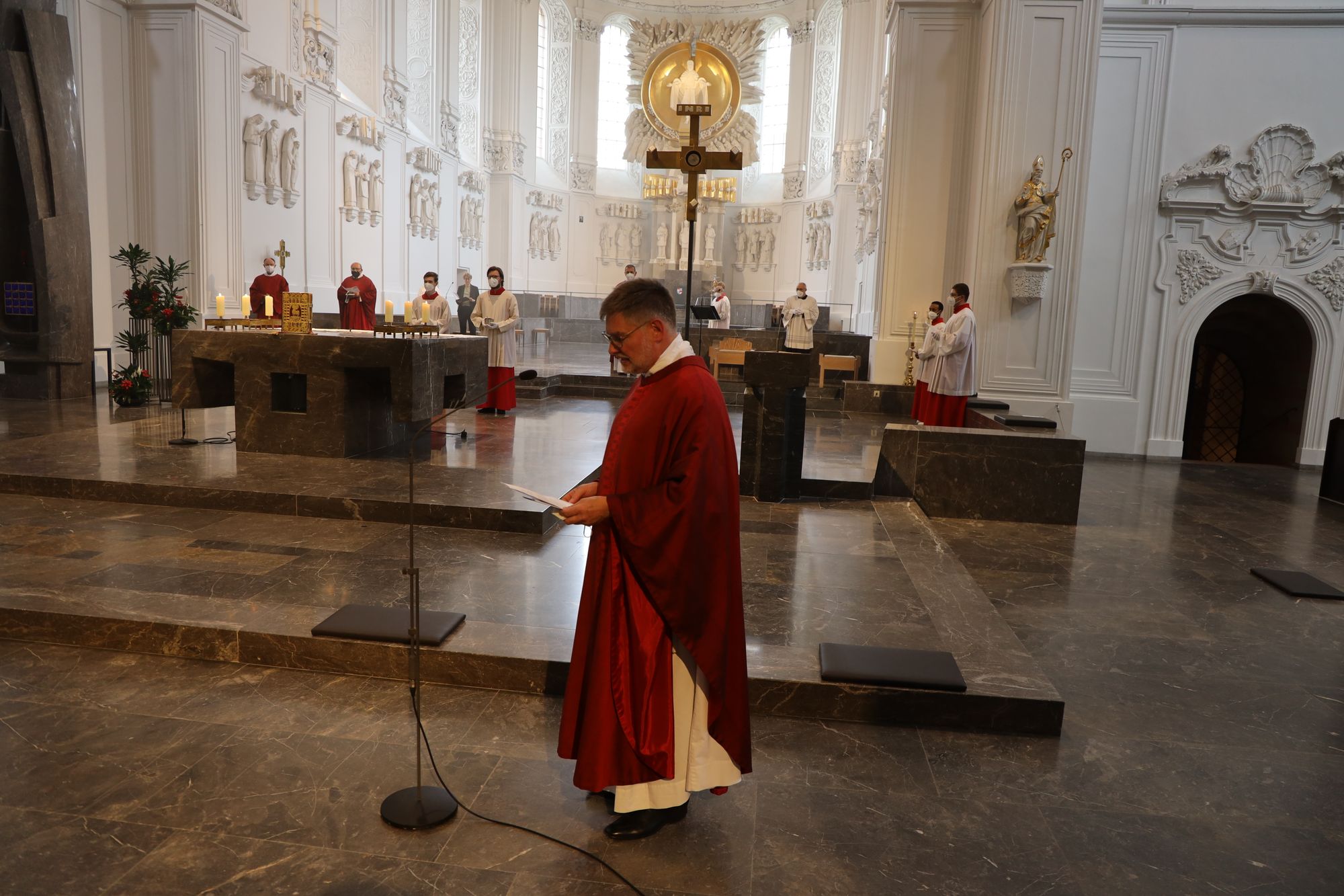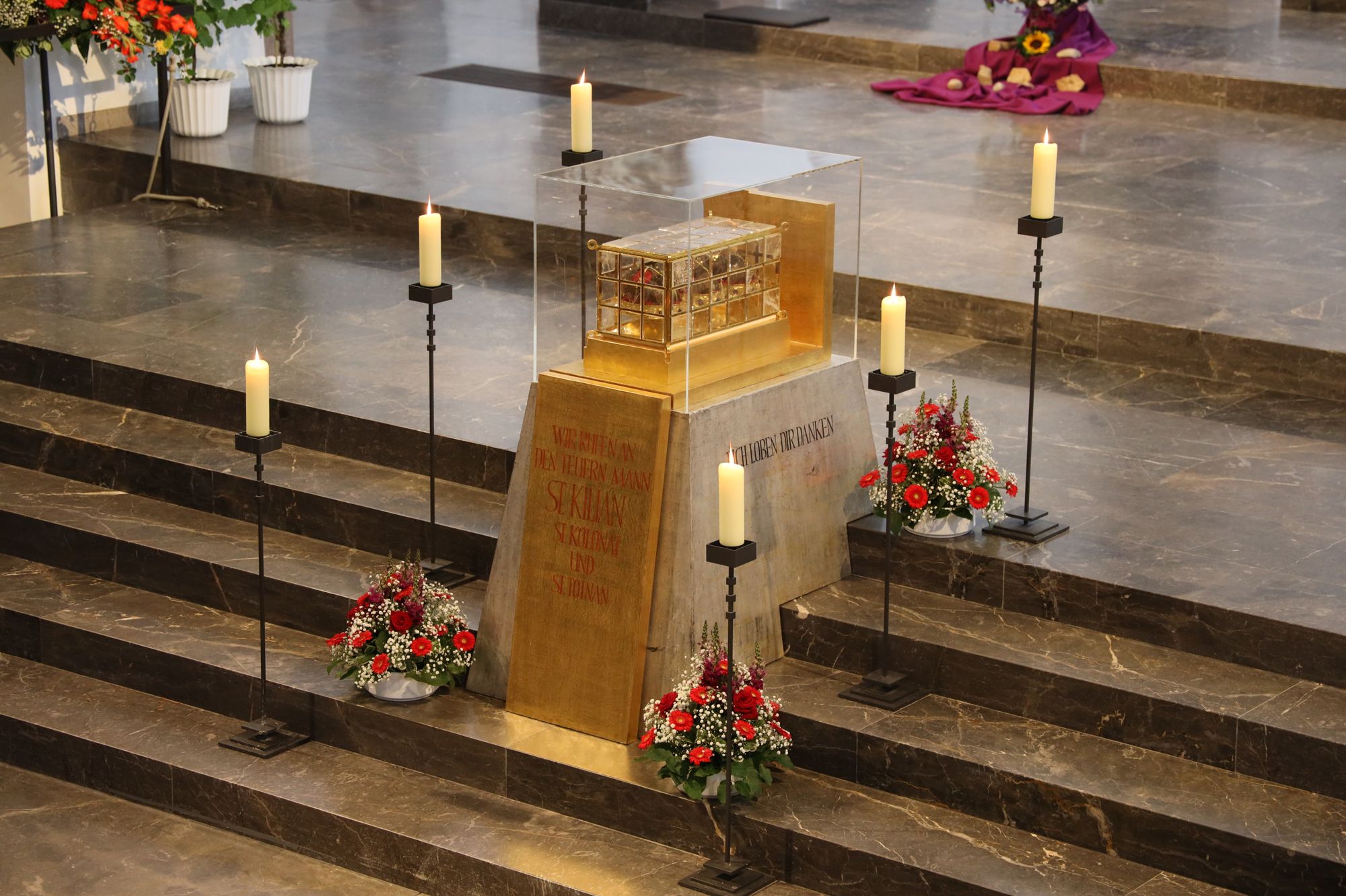 Würzburg (POW) 33 Frauen und sieben Männern hat Weihbischof Ulrich Boom im Auftrag von Bischof Dr. Franz Jung am Freitagabend, 9. Juli, beim Kiliani-Tag der Verantwortlichen in Schule und Erziehung die Missio canonica verliehen. Bei einer Eucharistiefeier unter den aktuellen Coronaschutzvorschriften mit rund 120 Gläubigen im Kiliansdom erklärte der Weihbischof, die Frankenapostel Kilian, Kolonat und Totnan seien wie die Menschen in der aktuellen Coronapandemie mit Sorgen und Nöten konfrontiert gewesen. Aber sie hätten ein tiefes Vertrauen gehabt, das sich auf sie selbst, die Gemeinschaft und nicht zuletzt auf Gott gegründet habe. „In Jesus Christus hat Gott uns gezeigt, wie nahe er uns ist in unserem Leben und Sterben, in unseren Unsicherheiten und Ängsten.“ Insofern seien die Frankenapostel Vorbilder und Helfer, „sowohl im Blick auf die globale Krise, verursacht durch den Coronavirus, als auch auf die noch tiefer sitzende Verunsicherung durch den Virus des Misstrauens“. Gemeinsam mit Leitendem Schulamtsdirektor i. K. Jürgen Engel, Leiter der Abteilung Schule und Hochschule, übergab der Weihbischof den neuen Religionslehrern dieses Schuljahres die Beauftragungsurkunden. Pandemiebedingt musste die Begegnung nach dem Gottesdienst entfallen.