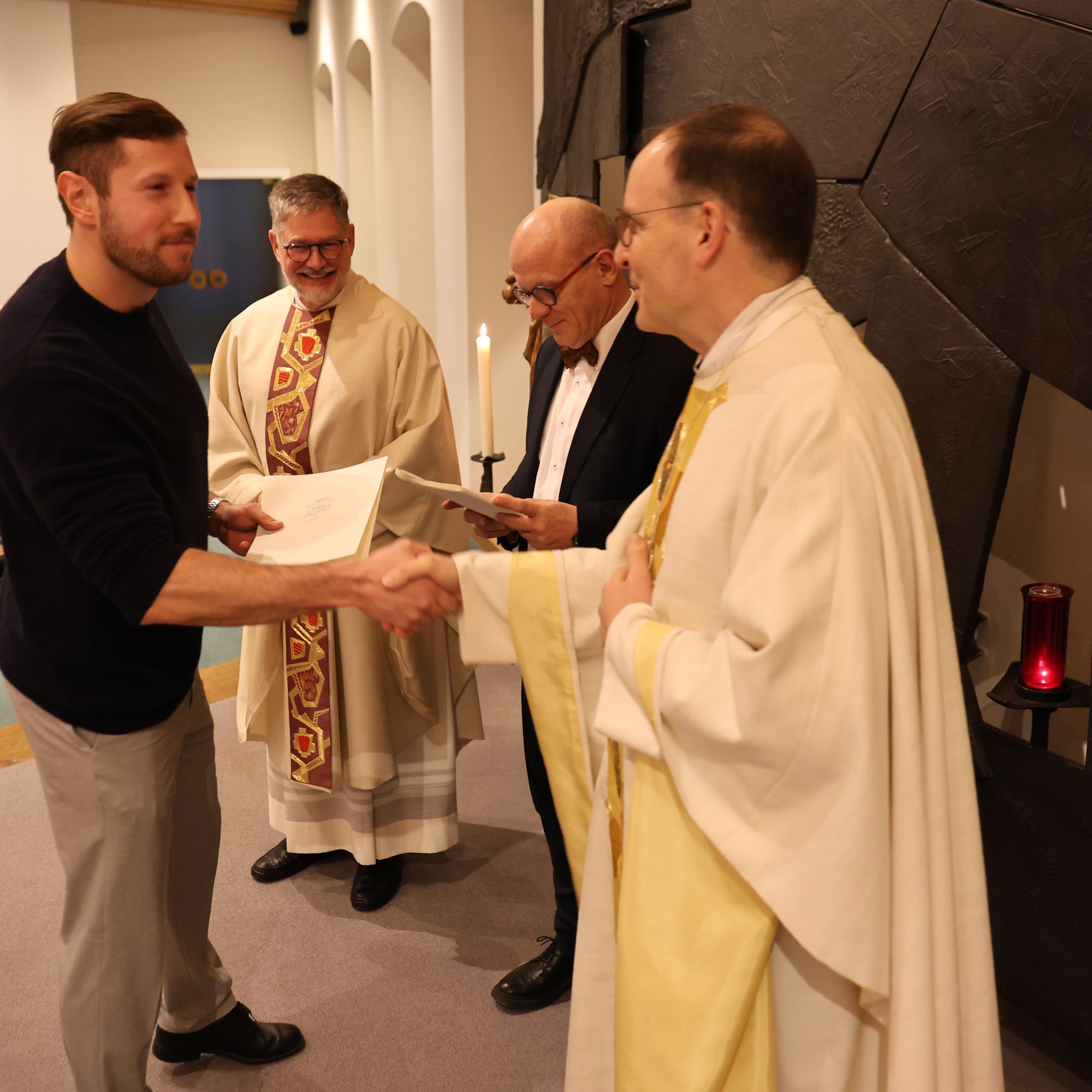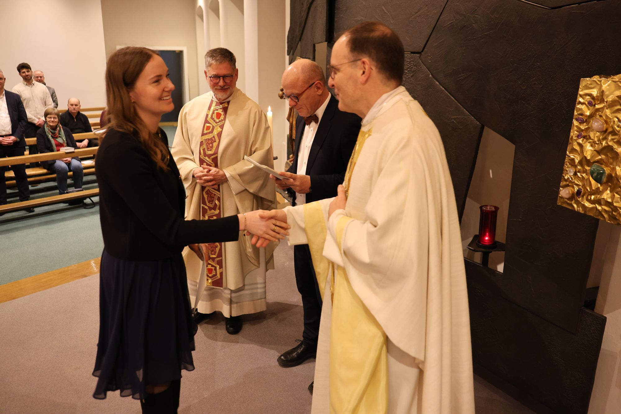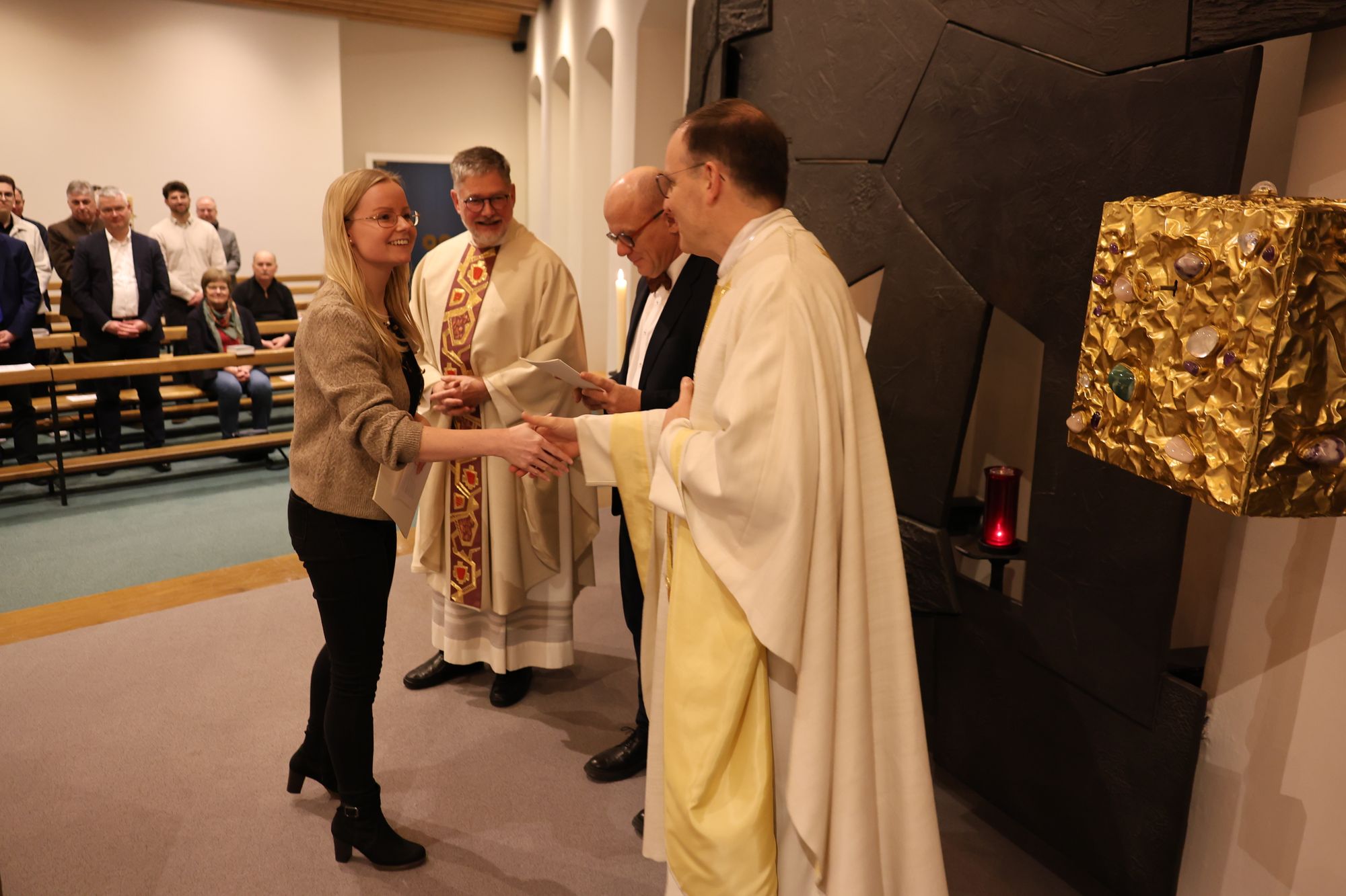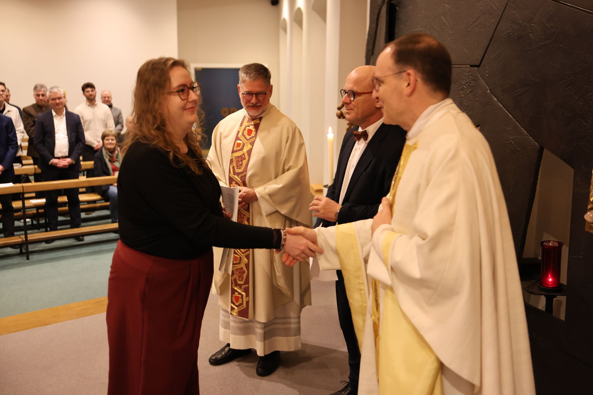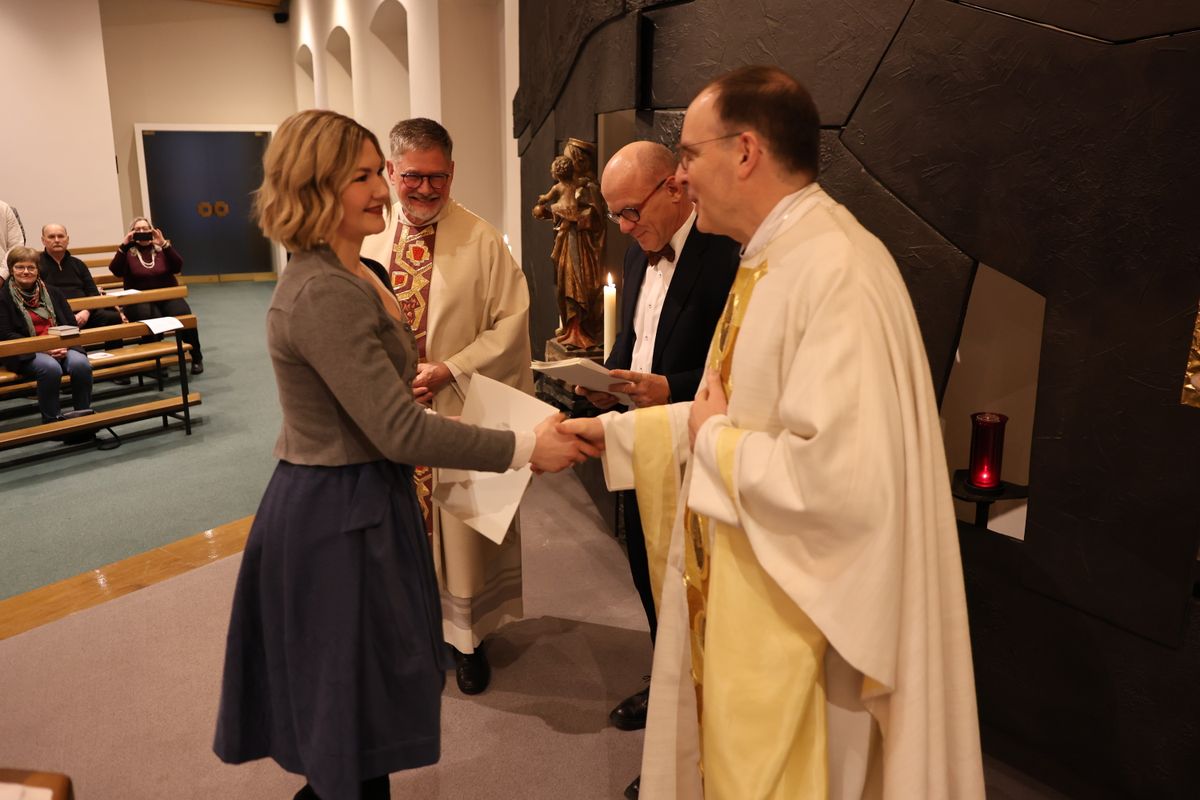 An dem Gottesdienst nahmen neben Jürgen Engel, Leitender Schulamtsdirektor im Kirchendienst, auch die Seminarlehrer Studiendirektor Peter Herrmann (Matthias-Grünewald-Gymnasium) und Studiendirektorin Elke Obermeier (Wirsberg-Gymnasium), Mentor Dr. Johannes Pfeiff vom Religionspädagogischen Institut der Diözese Würzburg, Dr. Robert Christoph, Ministerialbeauftragter für die Gymnasien in Unterfranken, Pfarrerin Susanne Wildfeuer, Leiterin des Schulreferates im evangelisch-lutherischen Dekanat Würzburg, sowie Eltern und Freunde der Beauftragten teil.