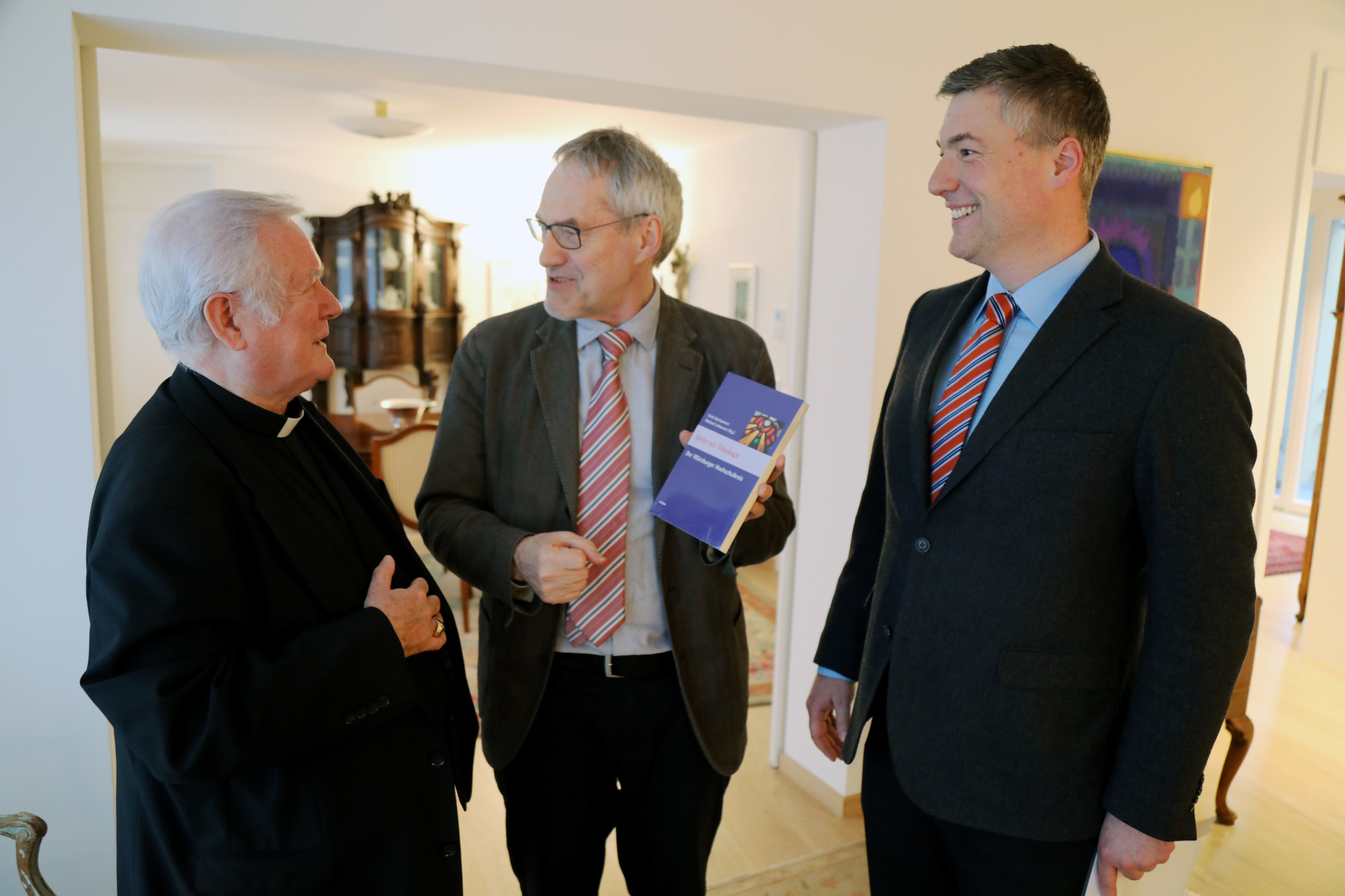 Würzburg (POW) Ein Exemplar des Buchs „Mehr als Theologie. Der Würzburger Hochschulkreis“ haben am Dienstag, 5. Dezember, die beiden Herausgeber Professor Dr. Erich Garhammer und Dr. Michael Lohausen an Bischof em. Dr. Friedhelm Hofmann überreicht. Der 16. Band der während Garhammers Dekanat an der Katholisch-Theologischen Fakultät der Universität Würzburg (2009 bis 2011) ins Leben gerufenen Reihe „Würzburger Theologie“ ist dem Bischof anlässlich seines 25. Bischofsjubiläums gewidmet.