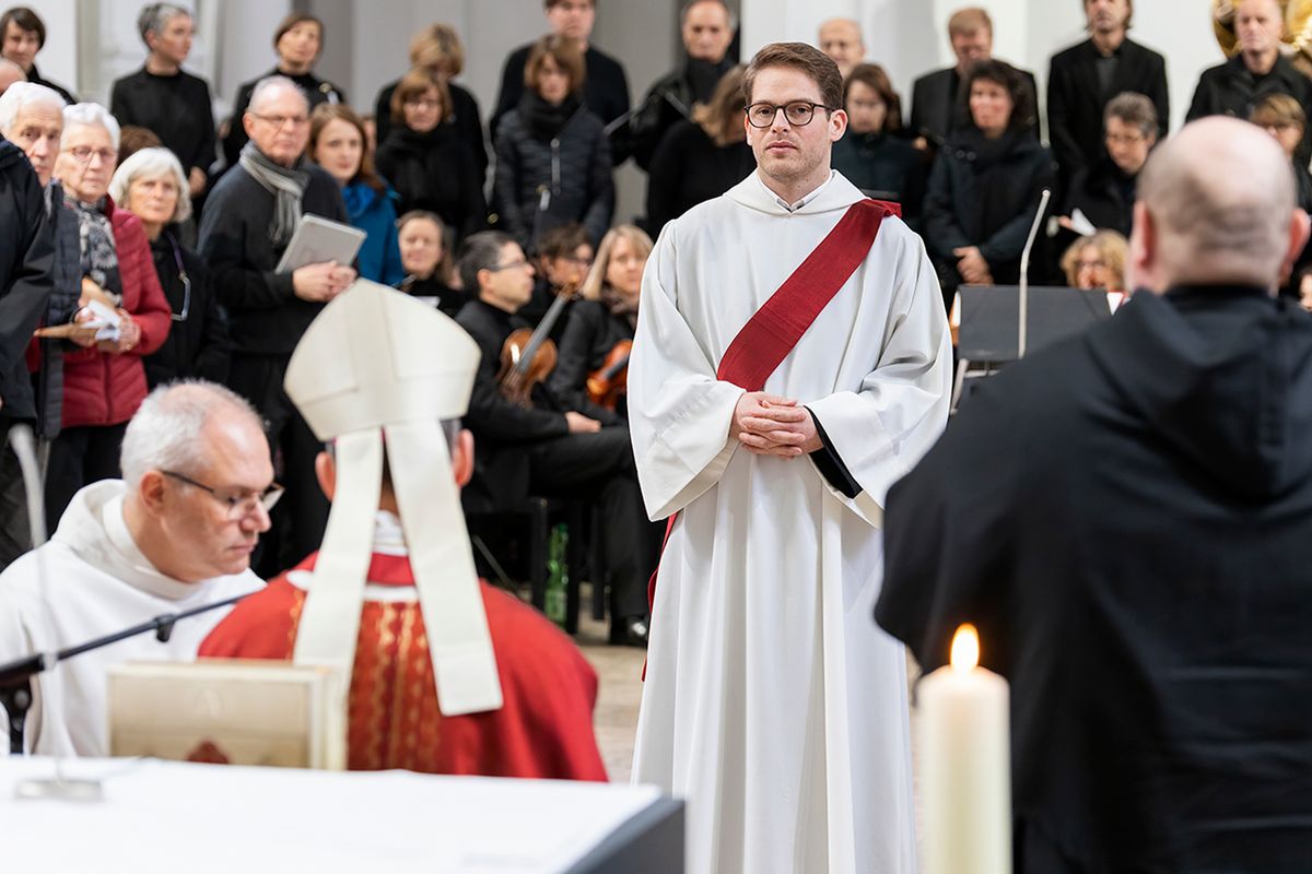 Nachdem Holzheimer als Weihekandidat aufgerufen worden war und sein „Ich bin bereit!“ gesprochen hatte, erinnerte Bischof Jung zu Beginn des Gottesdienstes an den Festtag des Apostels Andreas. Er wünschte dem Weihekandidaten, dass er – wie der Apostel Andreas – nach der Begegnung mit Jesus den Menschen die Erkenntnis, dass Jesus der Messias, der Gesalbte Gottes, sei, weitersagen und sie zur eigenen Begegnung mit Christus führen könne.