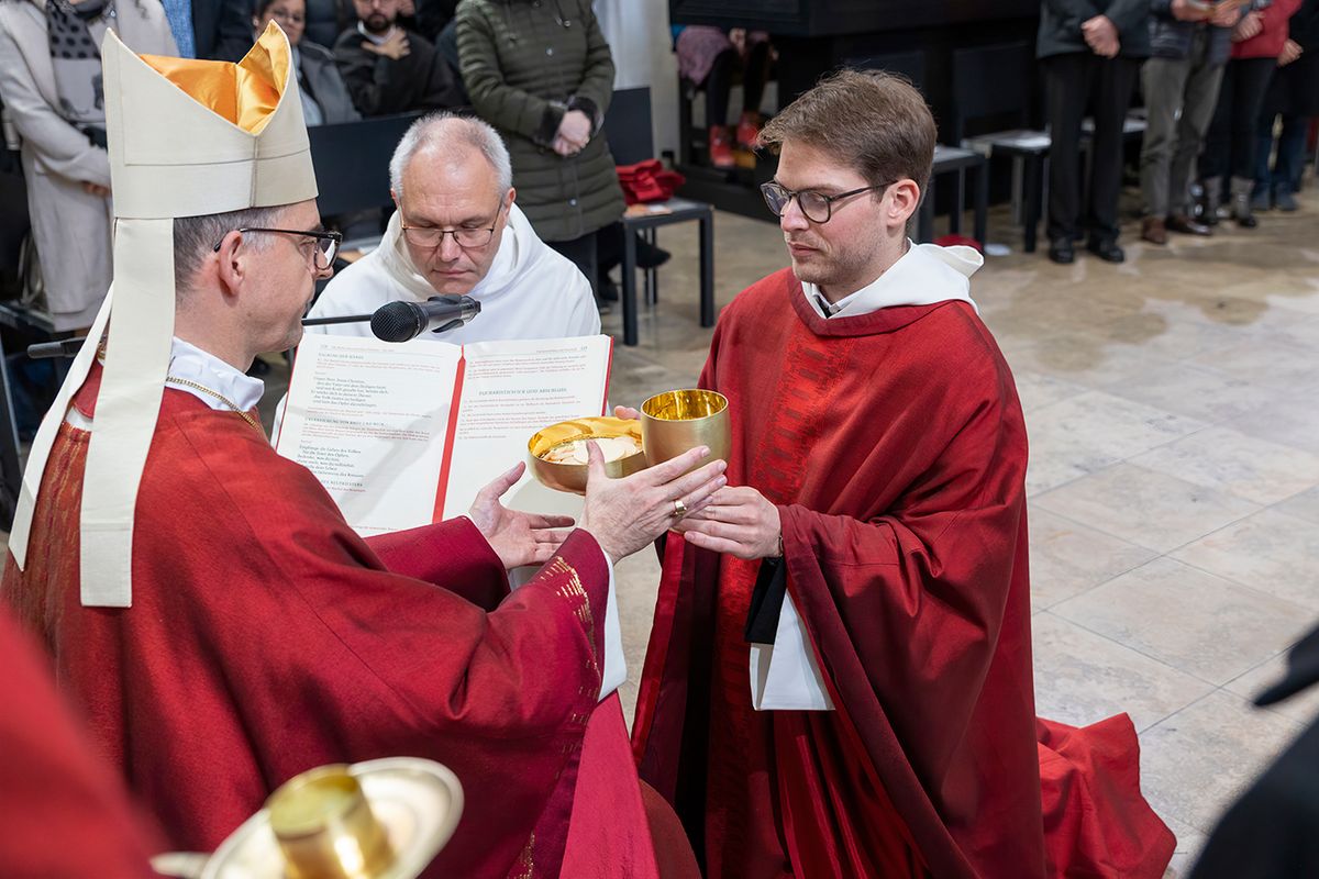 Nach dem Heilig-Geist-Hymnus legte Holzheimer sein Weiheversprechen in die Hände von Bischof Jung ab. Mit der gesungenen Allerheiligen-Litanei wurden all die Heiligen, die eingefügt sind in Gottes Heilsgeschichte vom Ersten Testament bis unsere Zeit, angerufen und um ihren Beistand gebeten. Anschließend wurde Holzheimer unter Handauflegung und Gebet zum Priester geweiht und ihm wurden die priesterlichen Gewänder angezogen. Mit der Salbung seiner Hände mit Chrisam-Öl und der Übergabe von Hostienschale und Kelch wurde er damit beauftragt, in den Sakramenten Gottes heilsame und stärkende Gegenwart den Menschen zu vergegenwärtigen. Anschließend feierte Holzheimer an der Seite des Bischofs mit der versammelten Gemeinde die Eucharistie, um am Ende des Gottesdienstes den Primiz-Segen zu spenden.