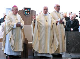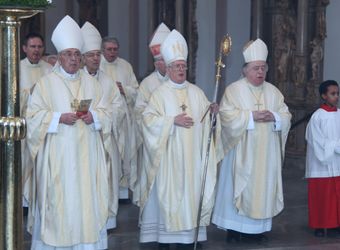 Festgottesdienst am 13. April 2013 im Kiliansdom in Würzburg zum 85. Geburtstag von Bischof em. Dr. Paul-werner Scheele und 80. Geburtstag von Weihbischof em. Dr. Helmut Bauer (von links): Weihbischof em. Helmut Bauer, Bischof Dr. Friedhelm Hofmann und Bischof em. Dr. Paul-Werner Scheele.