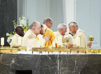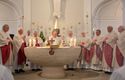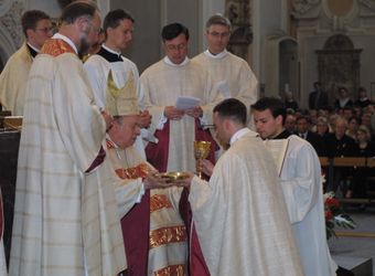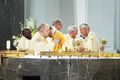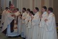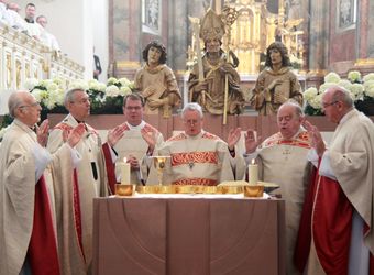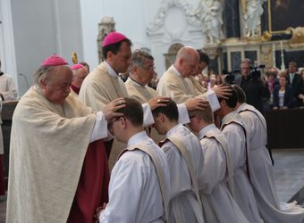 Priesterweihe am 7. Juni 2014 im Kiliansdom in Würzburg: Rund 100 Priester legen (von links) Andreas Hartung, Paul Reder, Dr. Simon Schrott, Michael Schmitt und Sebastian Krems die Hände auf. Vorne links Bischof em. Dr. Paul-Werner Scheele.