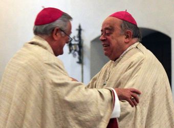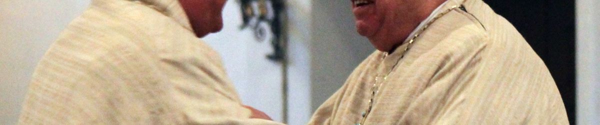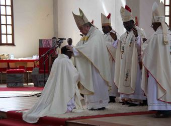 Bischof em. Dr. Paul-Werner Scheele legt am 5. Juni 2011 John C. Ndimbo, dem neuen Bischof des Partnerbistums Mbinga, bei der Weihehandlung im Kiliansdom in Mbinga die Hände auf den Kopf.