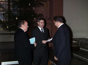 Mitliturgie des Bischofs im Kiliansdom: Bischof Paul-Werner gratulierte Domorganist Paul Damjakob (rechts) zur Auszeichnung durch den Würzburger Diözesangeschichtsverein und den Priesterverein der Diözese im Dezember 2002. Damjakob spielte über 40 Jahre in Neumünsterkirche und Kiliansdom die Orgel. Professor Dr. Wolfgang Weiß (Mitte), Mitherausgeber der Diözesangeschichtsblätter, überreichte Damjakob den Ergänzungsband, der dem langjährigen Domorganisten gewidmet ist.