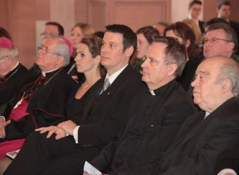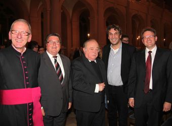 Festakt zum zehnjährigen Bestehen des Museums am Dom in Würzburg am 10. Oktober 2013 in der Neubaukirche in Würzburg (von links): Kunstreferent Domkapitular Dr. Jürgen Lenssen, Würzburgs Bürgermeister Dr. Adolf Bauer, Bischof em. Dr. Paul-Werner Scheele, Regisseur Christian Stückl und Dr. Rainer Dvorak, Direktor der Katholischen Akademie Domschule.