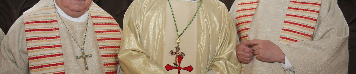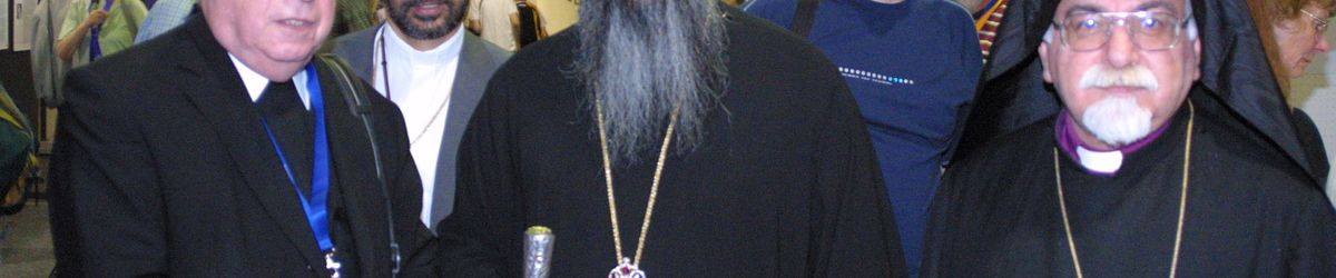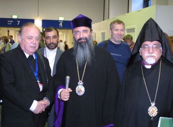 Bischof Dr. Paul-Werner Scheele auf dem Ökumenischen Kirchentag 2003 in Berlin mit Erzbischof Mesrob II. Mutafyan, Armenischer Patriarch von Istanbul und der ganzen Türkei (Mitte), und Erzbischof Karekin Bekdjian, Primas der Armenischen Kirche in Deutschland.