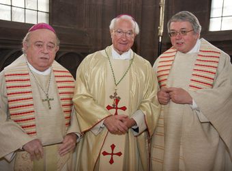 Festgottesdienst im Kiliansdom in Würzburg am 13. April 2013 anlässlich der Geburtstage von Bischof em. Dr. Paul-Werner Scheele (85) und Weihbischof em. Helmut Bauer (80) (von links): Bischof em. Dr. Paul-Werner Scheele, Bischof Dr. Friedhelm Hofmann und Weihbischof em. Helmut Bauer.