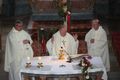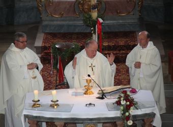 Wallfahrt der Priester am 10. Mai 2013 von Steinbach zum Wallfahrtsort Mariabuchen im Spessart. Das Wallfahrtsamt zelebrierte Bischof em. Dr. Paul-Werner Scheele (Mitte) zusammen mit Pater Guardian Pawel Kusiak (OFM Conv.) (links) und Dekan Hermann Becker (Marktheidenfeld, rechts).