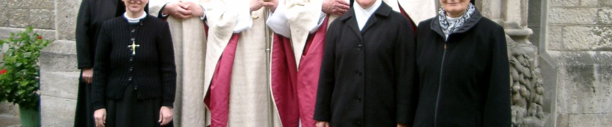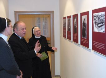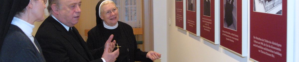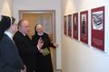 Eröffnung dreier Gedenkräumen für Mystikerin im Mutterhaus der Erlöserschwestern: Schwester Caritas Bretz, Bischof Dr. Paul-Werner Scheele und Generaloberin Dr. Veronika Stauch (von links) vor den Bildtafeln zum Leben von Schwester Julitta Ritz.
