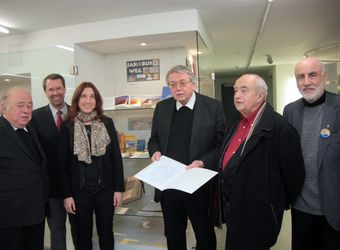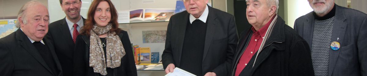 Manfred Zentgraf, Gründungsmitglied der Fränkischen Sankt Jakobus-Gesellschaft und Redakteur der Vereinszeitschrift „unterwegs – im Zeichen der Muschel“, überlässt der Diözese Würzburg am 15. November 2013 im Rahmen eines Schenkungsvertrags seine umfangreiche Jakobus- und Pilgerbibliothek. Bei der Ausstellungseröffnung in der Diözesanbibliothek (von links): Bischof em. Dr. Paul-Werner Scheele, Archivdirektor Professor Dr. Johannes Merz, stellvertretende Bibliotheksleiterin Nikola Willner, Generalvikar Dr. Karl Hillenbrand mit Schenkungsvertrag, Manfred Zentgraf und Monsignore Gottfried Amendt.