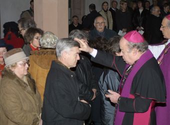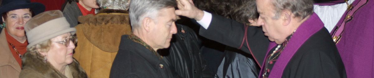 Gottesdienst zum Aschermittwoch mit über 200 Kunstschaffenden aus Unterfranken in der Sepultur des Domes. Nach der Segnung der Asche legten Weihbischof em. Helmut Bauer und Bischof em. Dr. Paul-Werner Scheele Künstlern die Asche als Zeichen der Buße auf die Stirn.