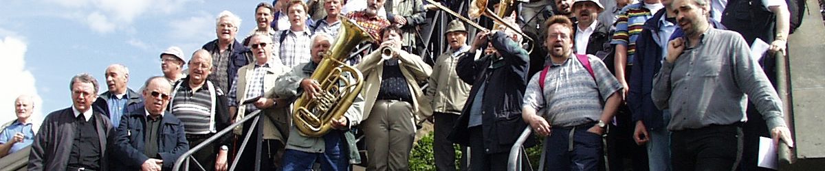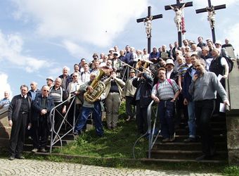 Gruppenbild an der Kreuzigungsgruppe: Die Teilnehmer der Priesterwallfahrt 2002 mit Bischof Dr. Paul-Werner Scheele (vierter von links) und Generalvikar Dr. Karl Hillenbrand (zweiter von links). Rund 100 Priester und Diakone aus der Diözese Würzburg pilgerten vom Würzburger Haus zum Kreuzberg in der Rhön. Die Wallfahrt auf dem Kardinal-Döpfner-Weg stand unter dem Leitspruch des aus Hausen bei Bad Kissingen stammenden früheren Würzburger Bischofs Julius Döpfner, „Wir verkündigen Christus als Gekreuzigten“.