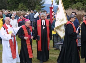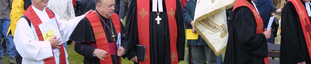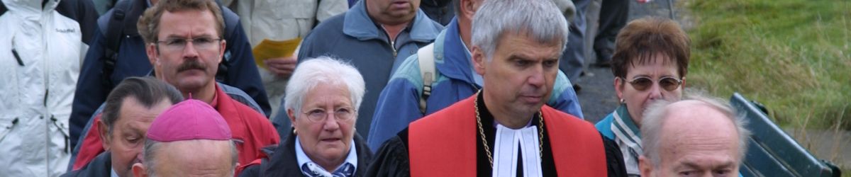 Ökumene in der Praxis vor Ort: Im Jahr 2002 kommt es zur erste ökumenischen Wallfahrt zum Kreuzberg in der Rhön. Bischof Paul-Werner und der evangelisch-lutherische Landesbischof Johannes Friedrich fordert das gemeinsame Zeugnis aller Christen. Alternativ: Bischof Dr. Paul-Werner Scheele, Landesbischof Johannes Friedrich und der ukrainische lutherische Bischof Edmund Ratz (von links) sowie zahlreiche evangelische und katholische Christen bei der ersten ökumenischen Wallfahrt zum Kreuzberg.
