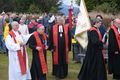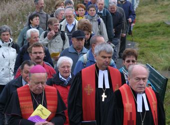 Bischof Dr. Paul-Werner Scheele, Landesbischof Johannes Friedrich und der ukrainische lutherische Bischof Edmund Ratz (von links) sowie zahlreiche evangelische und katholische Christen bei der ersten ökumenischen Wallfahrt zum Kreuzberg.