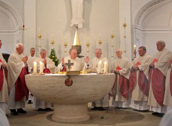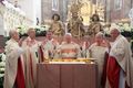Bischofsweihe von Ulrich Boom am 25. Januar 2009 im Kiliansdom in Würzburg: Bischof Dr. Friedhelm Hofmann salbt Ulrich Boom zum Bischof. Links Bischof em. Dr. Paul-Werner Scheele, rechts Weihbischof em. Helmut Bauer.