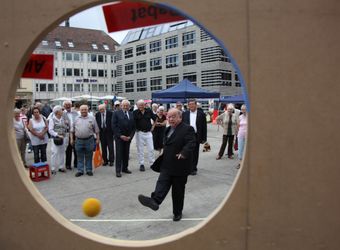 Bischof em. Dr. Paul-Werner Scheele versucht beim Aktionstag "Tor nach Afrika" am 12. Juni 2010 sein Glück an der Torwand.