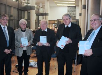 Jahresversammlung des Diözesangeschichtsvereins Würzburg am 15. November 2013 im Diözesanarchiv (von links): Vorsitzender Professor Dr. Wolfgang Weiß (links) überreicht die neuen Bände der Würzburger Diözesangeschichtsblätter sowie der "Quellen und Forschungen" an Hermann Fischer, Bischof em. Dr. Paul-Werner Scheele, Generalvikar Dr. Karl Hillenbrand und Referent Professor Dr. Anton Schindling.