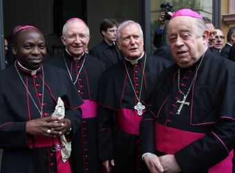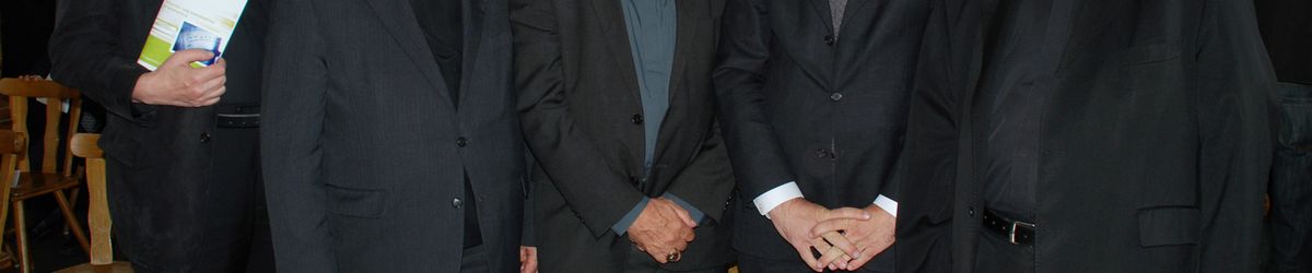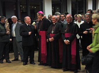 Empfang im Kolping-Center in Würzburg am 2. Februar 2012. Parallel zur Wiedereröffnung des Kiliansdoms wurde auch die Partnerschaftsurkunde mit dem Bistum Óbidos/Brasilien unterschrieben. Im Bild: Bischof em. Paul-Werner Scheele, Bischof Bernardo Johannes Bahlmann, Bischof Dr. Friedhelm Hofmann und Weihbischof Ulrich Boom (Mitte von links).