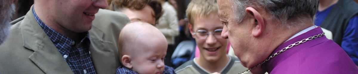 Zehn Männer und Frauen ließ Bischof Dr. Paul-Werner Scheele am 17. Februar 2002 im Neumünster zu Taufe, Firmung und Eucharistie zu. Er legte ihnen die Hände auf und überreichte ihnen jeweils eine Plakette mit dem Konterfei der drei Frankenapostel.