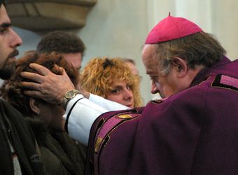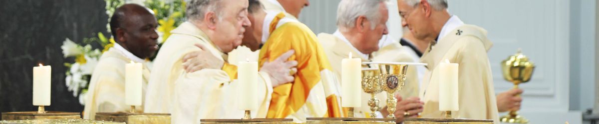 Bei einem feierlichen Gottesdienst im Würzburger Kiliansdom wurde Dr. Franz Jung zum Bischof geweiht und als 89. Bischof von Würzburg eingeführt. Bischof Jung umarmt Bischof em. Dr. Paul-Werner Scheele zum Friedensgruß.