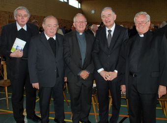 Priester- und Diakonentag der Diözese Würzburg am 17. September 2012 in Heidenfeld (von links): Generalvikar Dr. Karl Hillenbrand, Bischof em. Dr. Paul-Werner Scheele, Weihbischof Ulrich Boom, Referent Professor Dr. Winfried Haunerland (München) und Bischof Dr. Friedhelm Hofmann.