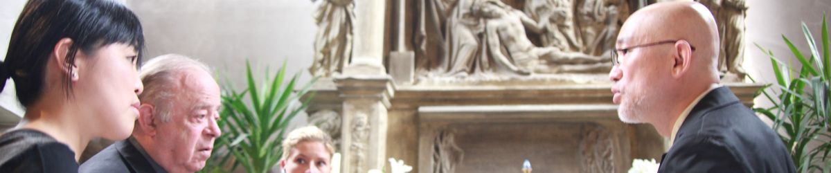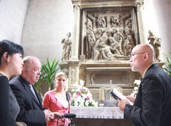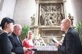 Japanische Journalisten am 5. September 2012 in Sankt Afra in Maidbronn: Bischof em. Dr. Paul-Werner Scheele (2. von rechts) erklärt den Tilman-Riemenschneider-Altar "Die Beweinung Christi" den japanischen Journalisten Takako Maruga (links) und Naohito Iwata. Im Hintergrund Regine Krieger von der Hörfunkredaktion des Bistums Würzburg.