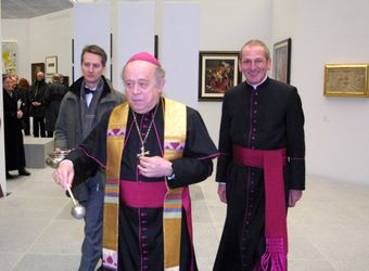 Das Museum am Dom in Würzburg wird am 6. März 2003 eröffnet: Bischof Dr. Paul-Werner Scheele segnet die neuen Räume. Rechts Domkapitular Dr. Jürgen Lenssen, links Bischofssekretär Dr. Martin Faatz.