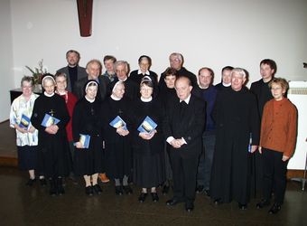 Bischof Paul-Werner und Benediktiner-Altabt Siegfried Hertlein präsentieren mit zahlreichen Ordensoberen und -oberinnen das Missionsbuch der Diözese Würzburg mit dem Titel „Geht hinaus in die ganze Welt ... Die Diözese Würzburg und ihre Missionskräfte“. Die Vertreterinnen und Vertreter der Missionsgemeinschaften im einzelnen (von links): Generaloberin Dr. Veronika Stauch (Erlöserschwestern), Rosl Gostner (Gemeinschaft der Missionshelferinnen), Generaloberin Veridiana Dürr (Oberzeller Franziskanerinnen), Provinzoberin Dagmar Fasel (Missions-Dominikanerinnen, Neustadt/Main), Provinzial Hubert Wendl (Mariannhiller Missionare), Bischof Dr. Paul-Werner Scheele und Altabt Siegfried Hertlein (Ndanda/Tandania).