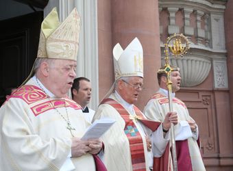 Fronleichnamsprozession am 19. Juni 2014 in Würzburg: Bischof Dr. Friedhelm Hofmann (Mitte) spendet auf der Treppe des Neumünsters den eucharistischen Segen. Links Bischof em. Dr. Paul-Werner Scheele, rechts Domkapitular Dr. Jürgen Vorndran, hinten Bischöflicher Sekretär Diakon Manfred Müller.