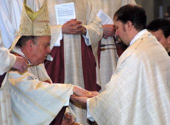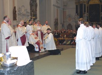 Pfarrer Andreas Heck bei seiner Priesterweihe 2002. Bischof Dr. Paul-Werner Scheele weiht Heck 2002 zum Priester.