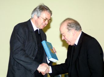 Bischof Paul-Werner und sein langjähriger kirchenmusikalischer Wegbegleiter Professor Siegfried Koesler bei seiner Verabschiedung in den Ruhestand. Nach 31 Jahren an der Würzburger Kathedralkirche legte Koesler am 18. Oktober 2002 den Dirigentenstab aus der Hand.