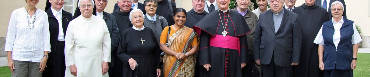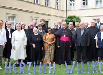 Kiliani-Wallfahrtswoche 2012 in Würzburg: Tag der Orden und der Weltmission am 11. Juli 2012: Bischof Dr. Friedhelm Hofmann (Mitte) und Bischof em. Dr. Paul-Werner Scheele (rechts von ihm) mit den Missionaren sowie Mitarbeitern der Diözesanstelle Mission-Entwicklung-Frieden im Innenhof des Mutterhauses der Erlöserschwestern in Würzburg.