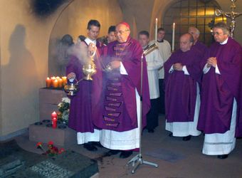Diözesanadministrator Weihbischof Helmut Bauer segnet und beweihräuchert das Grab von Bischof Dr. Josef Stangl im Würzburger Kiliansdom im Beisein von Bischof em. Dr. Paul-Werner Scheele und Domkapitular Dr. Karl Hillenbrand.