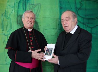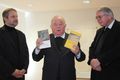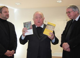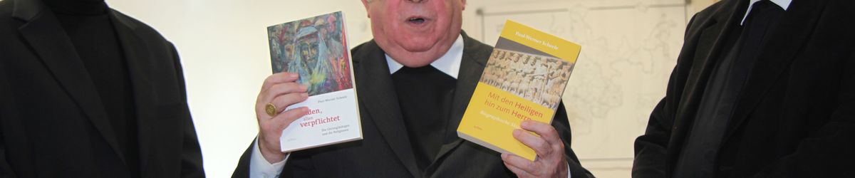 Bischof em. Dr. Paul-Werner Scheele stellt am 24. September 2013 im Diözesanarchiv in Würzburg seine zwei neuen Bücher vor: "Mit den Heiligen hin zum Herrn. Biographische Skizzen" und "Mit allen verbunden, allen verpflichtet. Die Christgläubigen und die Religionen". Links Verlagsleiter Thomas Häußner, rechts Generalvikar Dr. Karl Hillenbrand.