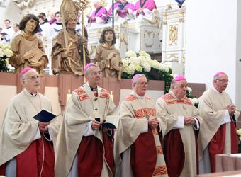 Kiliani-Internationaler Familiensonntag und 25. Jubiläum der Partnerschaft Würzburg-Mbinga am 13. Juli 2014 im Kiliansdom (vorne von links): Weihbischof em. Helmut Bauer, Bischof Dr. Friedhelm Hofmann, Bischof em. Dr. Paul-Werner Scheele und Bischof em. Dr. Emmanuel Mapunda aus Mbinga.