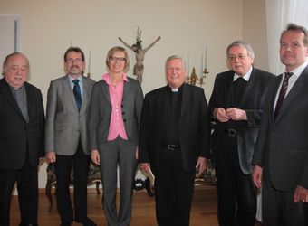 Antrittsbesuch der evangelischen Regionalbischöfin im Kirchenkreis Ansbach-Würzburg, Gisela Bornowski, am 28. Mai 2014 (von links): Bischof em. Dr. Paul-Werner Scheele, Philipp Hauenstein, Referent der Regionalbischöfin, Regionalbischöfin Gisela Bornowski, Bischof Dr. Friedhelm Hofmann, Generalvikar Dr. Karl Hillenbrand und Dr. Petro Müller, Ökumenereferent der Diözese Würzburg.