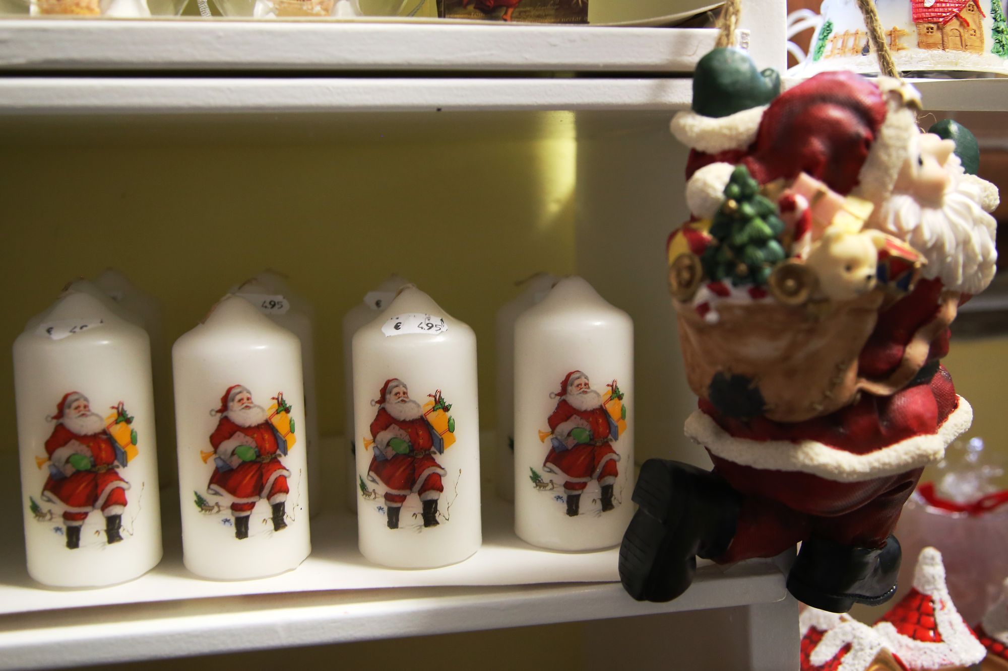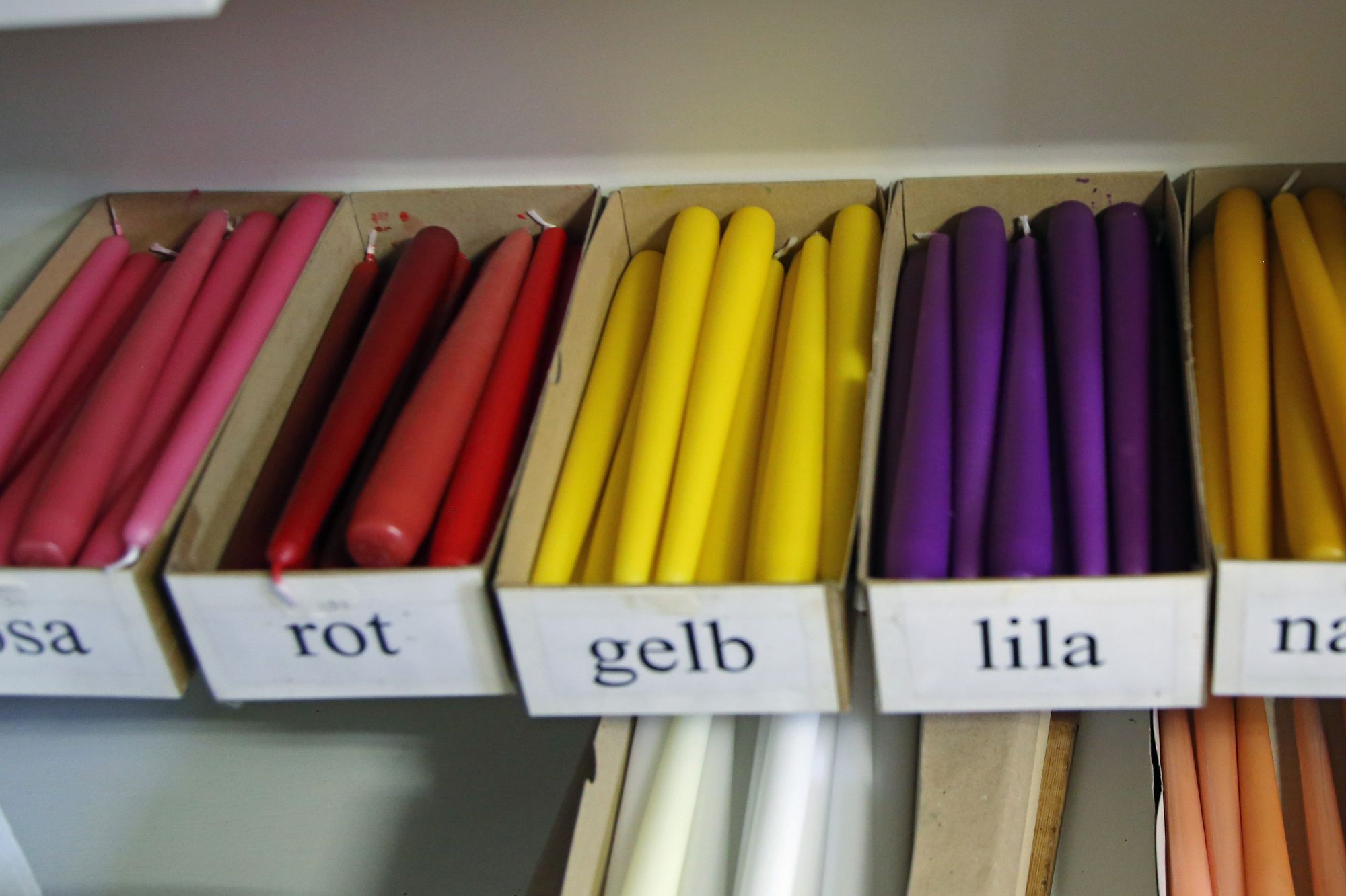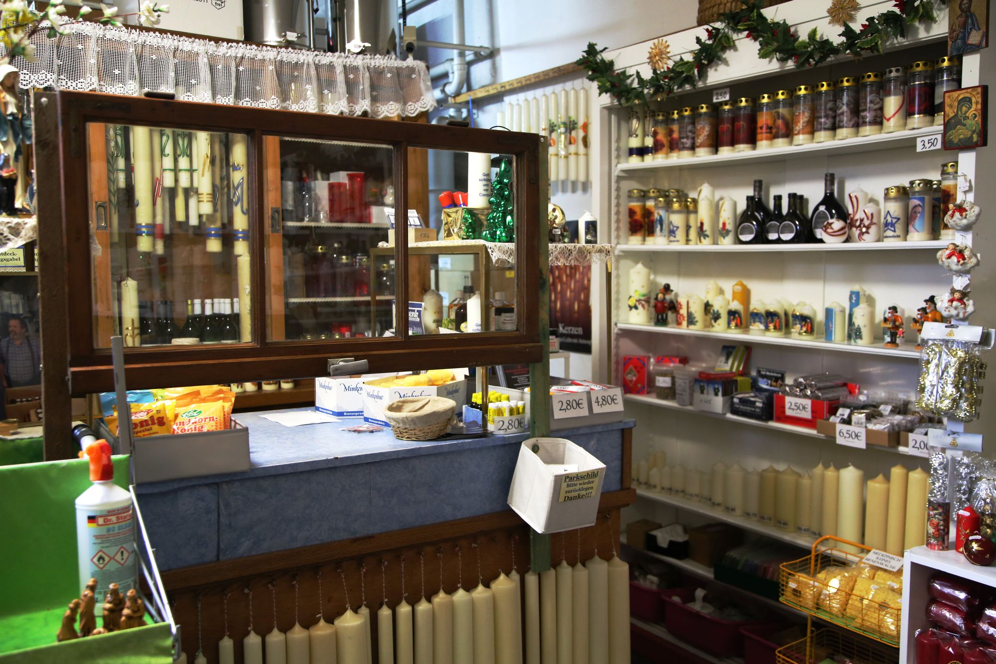 Hinter der Flügeltür geht es in einen als Warenlager genutzten Hinterhof. Auf der rechten Seite findet sich ein kleiner, weihnachtlich geschmückter Laden. Kerzen in allen Größen und Farben sind hier zu finden. Vor allem Weihnachtskerzen sind aufgereiht. Sie sind mit goldenen Engeln, roten Weihnachtsmännern, grünen Zweigen und Glitzer verziert. Es gibt auch Adventskalenderkerzen, die mit Zahlen von 1 bis 24 versehen sind und jeden Tag im Advent ein Stück herunterbrennen sollen. „Eine Spezialität von uns sind die Krippenstumpen“, erklärt Schenk. Das sind kleine, faustdicke Kerzen, in deren Aushöhlung die Krippenfiguren aus Wachs gebildet sind. Die zentimetergroßen Figuren sind fein und detailreich gestaltet und die Herstellung ist mit großem Aufwand verbunden. All diese Kerzen stellt die Familie Schenk selbst in ihrer Fabrik her.