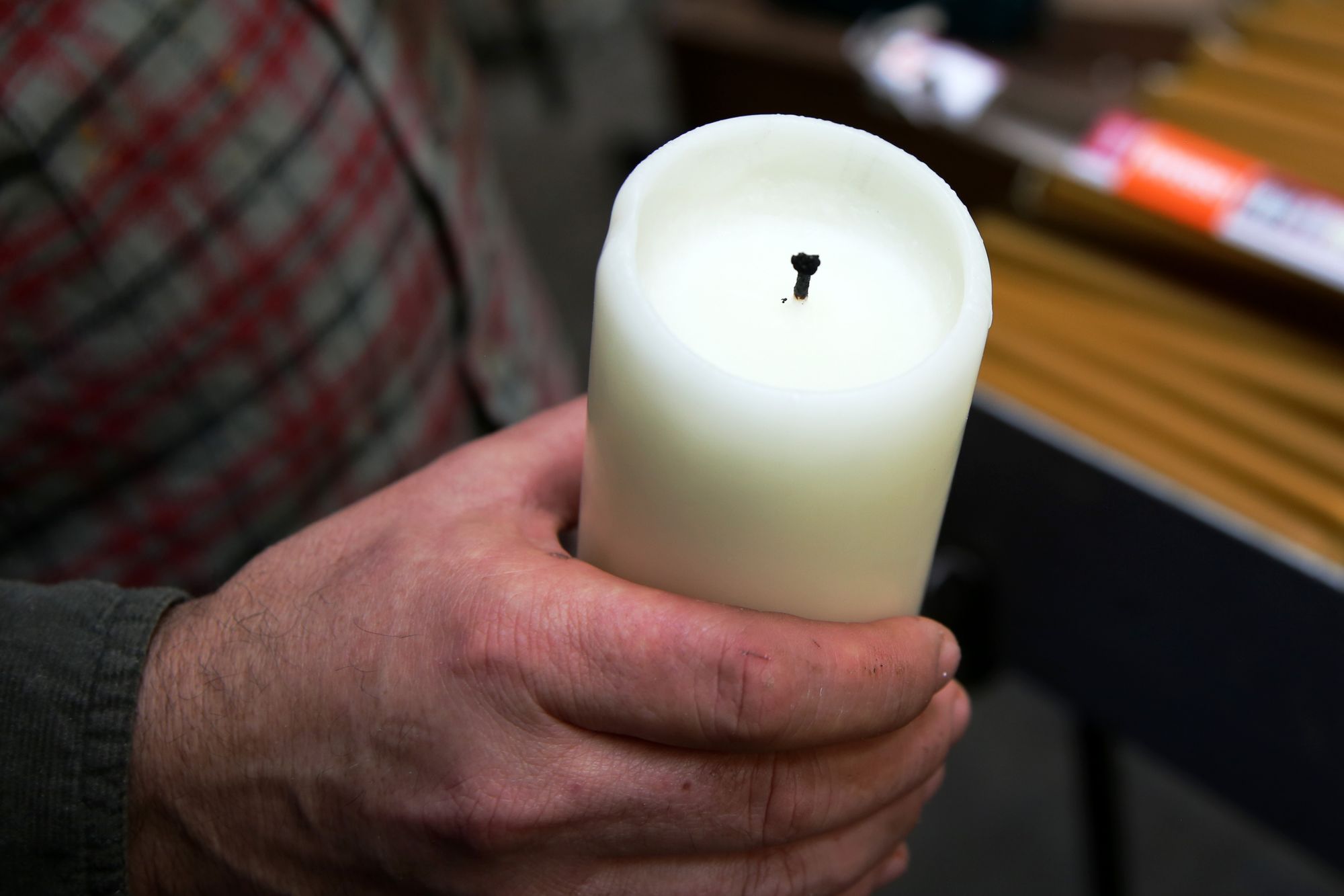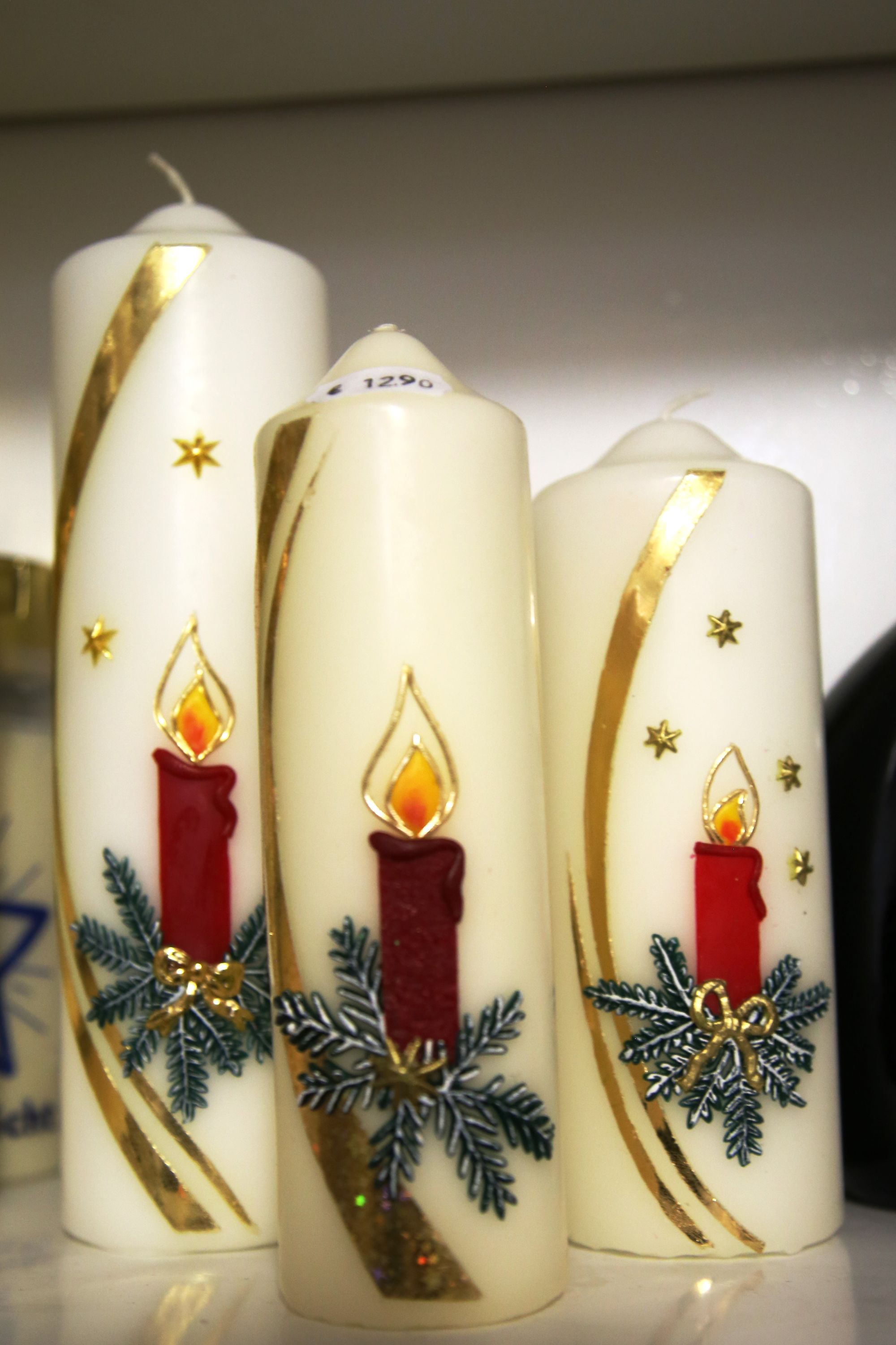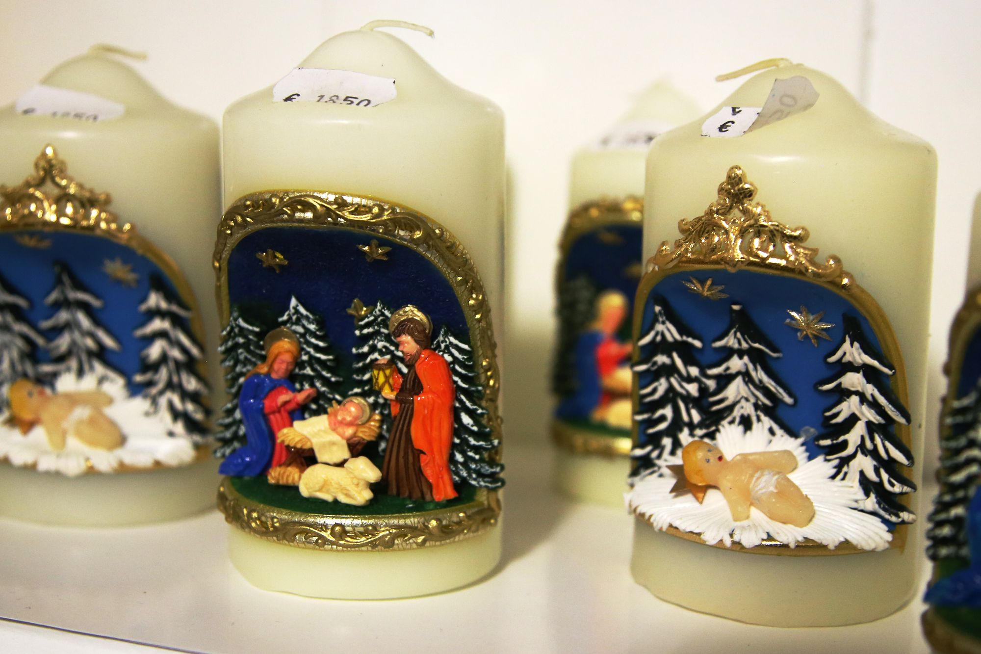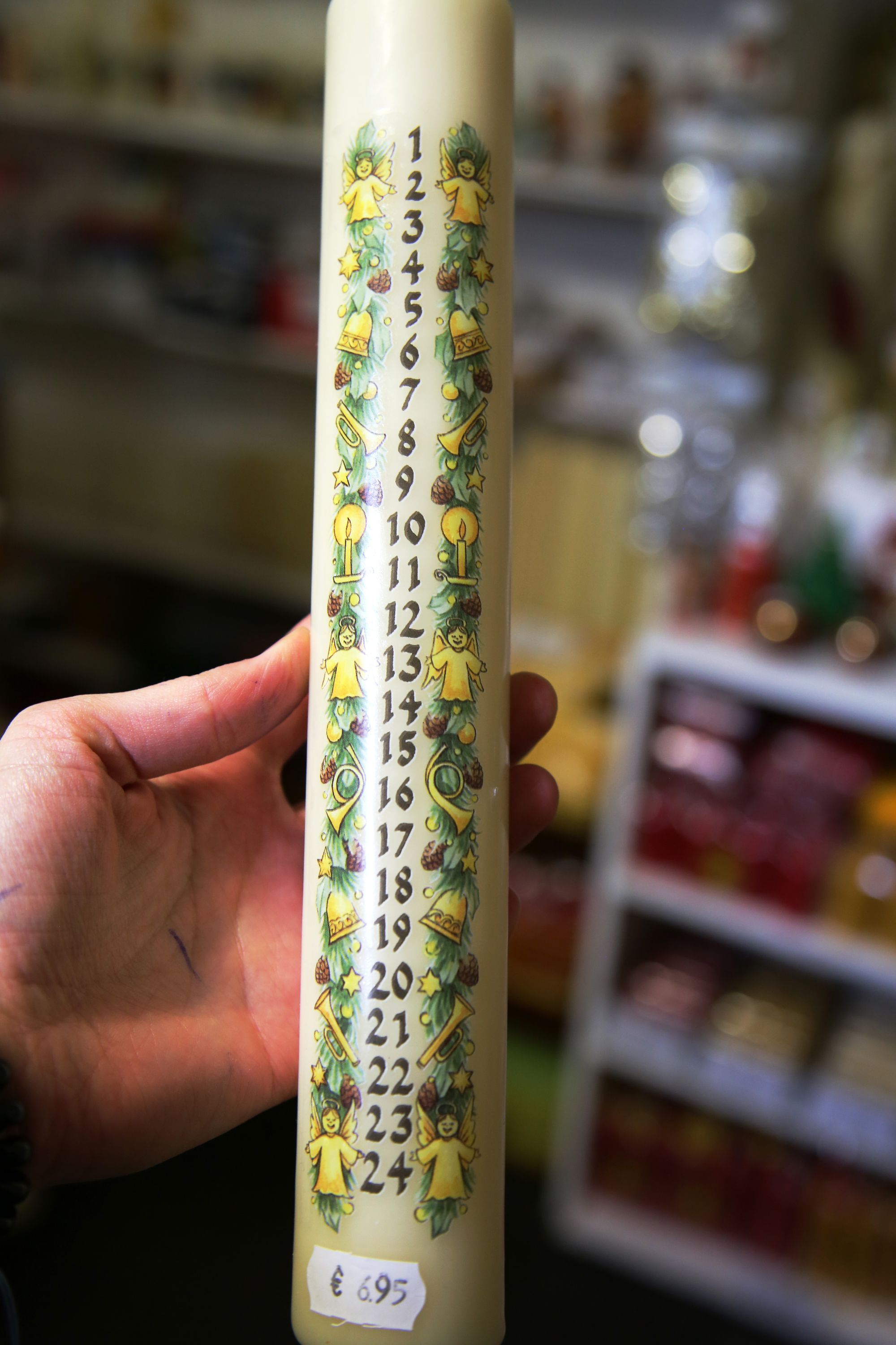 Hinter der Flügeltür geht es in einen als Warenlager genutzten Hinterhof. Auf der rechten Seite findet sich ein kleiner, weihnachtlich geschmückter Laden. Kerzen in allen Größen und Farben sind hier zu finden. Vor allem Weihnachtskerzen sind aufgereiht. Sie sind mit goldenen Engeln, roten Weihnachtsmännern, grünen Zweigen und Glitzer verziert. Es gibt auch Adventskalenderkerzen, die mit Zahlen von 1 bis 24 versehen sind und jeden Tag im Advent ein Stück herunterbrennen sollen. „Eine Spezialität von uns sind die Krippenstumpen“, erklärt Schenk. Das sind kleine, faustdicke Kerzen, in deren Aushöhlung die Krippenfiguren aus Wachs gebildet sind. Die zentimetergroßen Figuren sind fein und detailreich gestaltet und die Herstellung ist mit großem Aufwand verbunden. All diese Kerzen stellt die Familie Schenk selbst in ihrer Fabrik her.