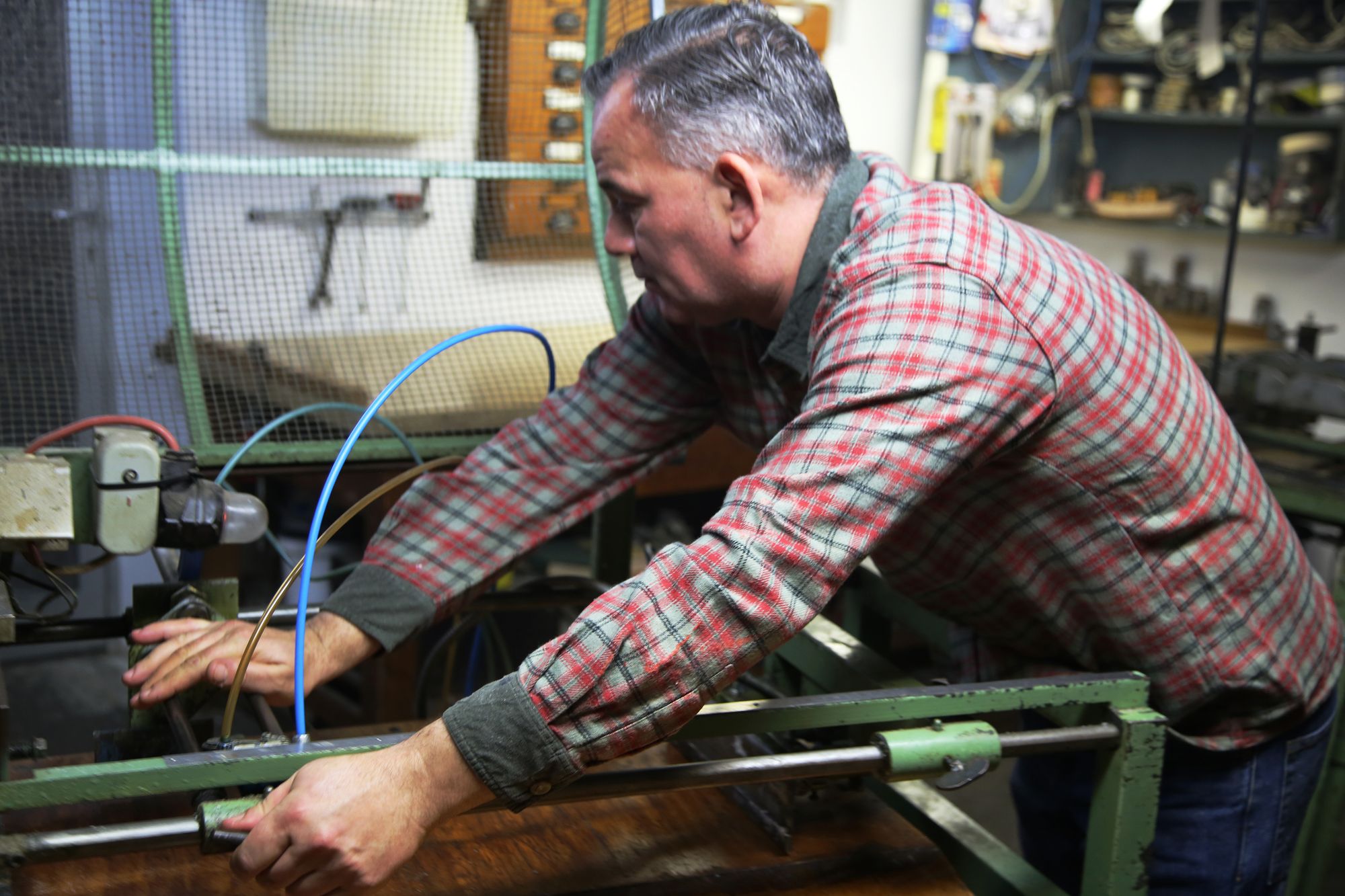 Bei dem Verfahren wird zunächst der 89 Meter lange Docht um die zwei Walzen gewickelt und zusammengeknotet. Den Knoten und den Docht darum herum markiert Schenk großzügig mit blauer Farbe. Die Kerze mit dem blauen Docht wird am Ende aussortiert, denn der darin versteckte Knoten aus Docht könnte durch die Materialdichte zu einer Stichflamme führen. „Ich könnte keine Nacht ruhig schlafen, wenn wegen mir ein Hausbrand ausgelöst wird“, betont er. Zwischen den Walzen steht eine Wanne mit warmem, flüssigem Wachs auf dem Boden. „Unsere Kerzen werden durchgefärbt und haben alle einen Bienenwachsanteil, das ist eine Besonderheit“, erläutert Schenk. Die Walzen ziehen den Docht immer wieder durch das Wachs, sodass der Kerzenstrang entsteht. Hat der die gewünschte Dicke, wird er in einzelne Kerzen geschnitten. Dafür wird er mit einem Förderband unter eine Schneidemaschine transportiert. „Die Maschinen werden nur für die Standardaufträge verwendet“, sagt Schenk. Kerzen mit einem größeren Durchmesser als 80 Millimeter werden per Hand gezogen, und Kerzen, die größer als 80 Zentimeter sind, werden per Hand geschnitten. „Die größten Kerzen, die wir angefertigt haben, waren für die Wallfahrtskirche ‚Zu Unserer Lieben Frau vom Kreuzberg‘ in Schwandorf. Die waren zweieinhalb Meter hoch und hatten einen Durchmesser von 16 Zentimeter“, erzählt Schenk. Nach dem Schneiden werden die geschnittenen Kerzen zum Auskühlen auf Marmorplatten gelegt. Sind die Kerzen ausgekühlt, wird der kegelförmige Kopf gefräst, die Kerze gefärbt und verziert. „Eine Altarkerze wird beispielsweise elfmal in die Hand genommen“, erklärt Schenk. Ein wichtiger Teil der Produktion ist das Probebrennen. „Die Kerzen sollen gleichmäßig abbrennen, damit eine schöne Brennschale entsteht. So muss nicht die Hälfte weggeschnitten werden und die Kerzen halten länger“, erläutert er.