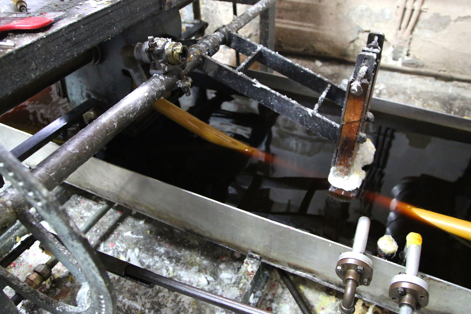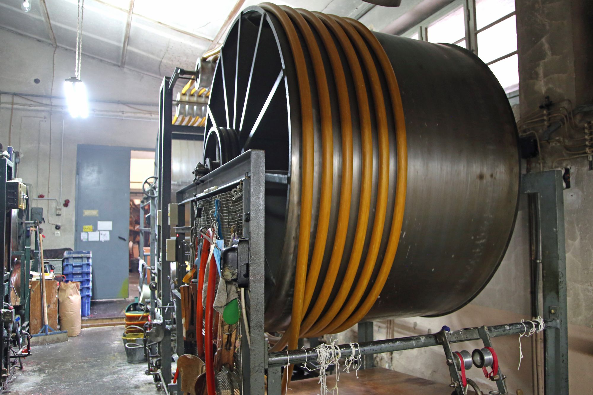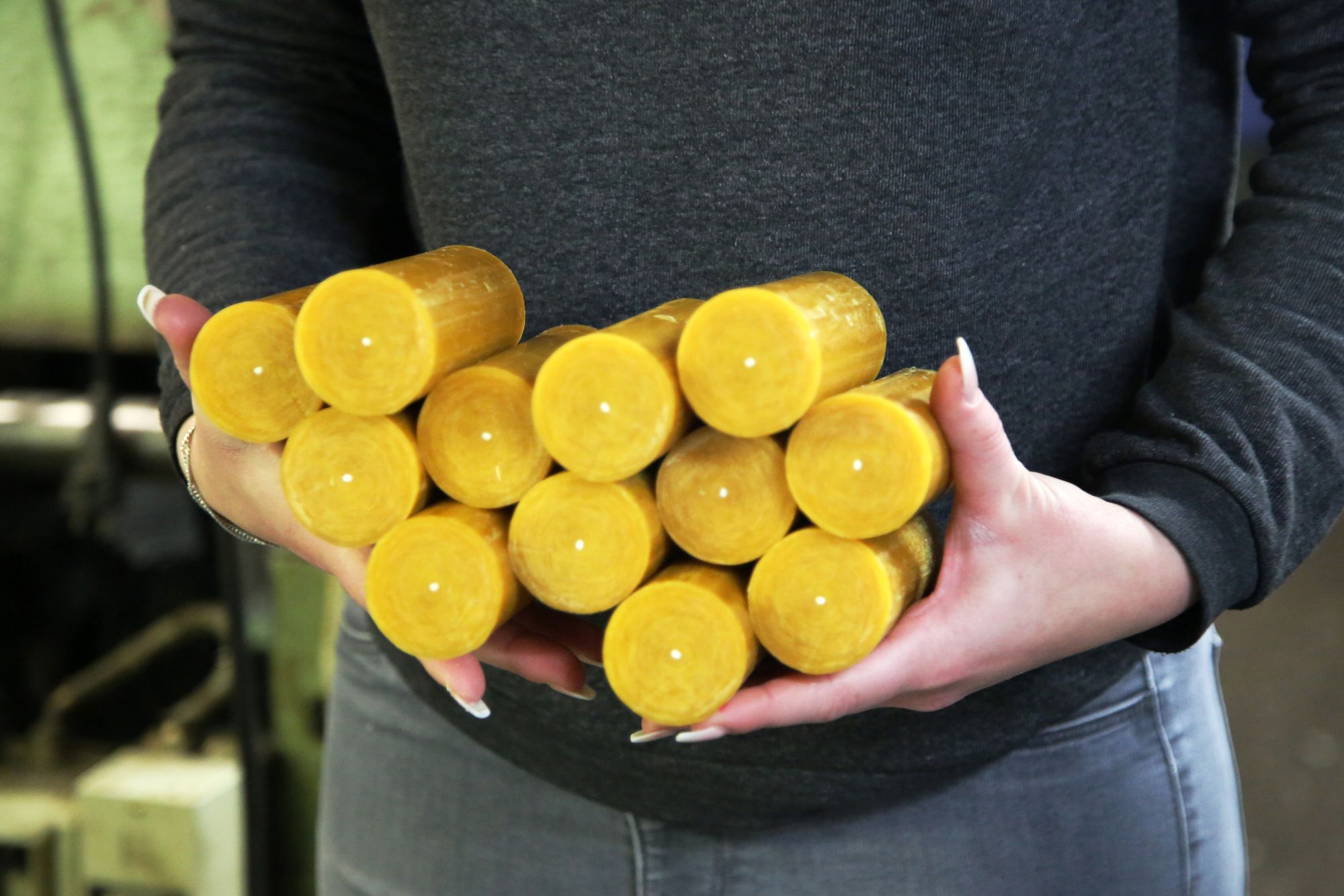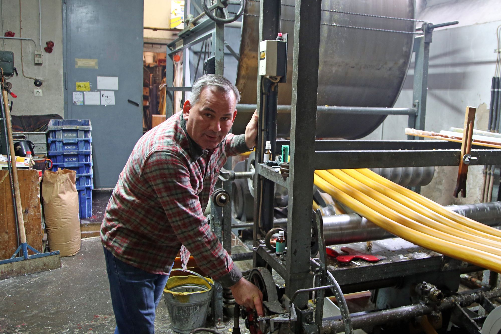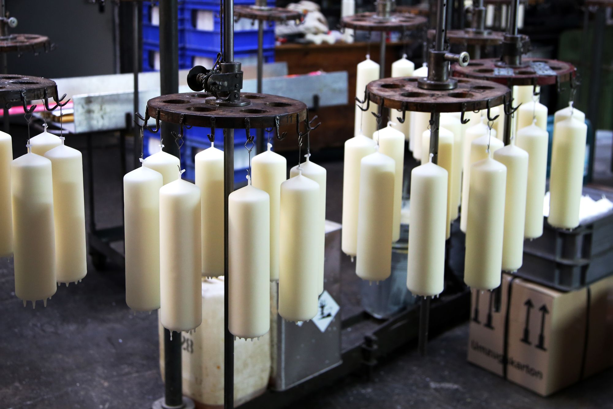Diese ist auf der linken Seite des Innenhofs zu finden. In den Hallen riecht es nach Wachs. Auf einer Maschine mit je zwei sich langsam drehenden, zirka 2,50 Meter großen Walzen ist der 89 Meter lange, gelbe Kerzenstrang aufgewickelt. „Das ist der Vorgang des Wachsziehens“, erklärt Schenk. Er selbst sei gelernter Wachsziehmeister. Mittlerweile gäbe es diesen Beruf nicht mehr. Heute heißt es Kerzenhersteller. Das liegt daran, dass sich die Produktion verändert hat: „Das Wachsziehen ist ein altes, langwieriges Verfahren, das kaum noch genutzt wird. Wir verwenden es, weil die Qualität viel besser ist“, erläutert Schenk. Vier Stunden lang ist die Maschine schon am Laufen und eine weitere Stunde dauert es noch, bis der Kerzenstrang in die verschiedenen Größen geschnitten werden kann.