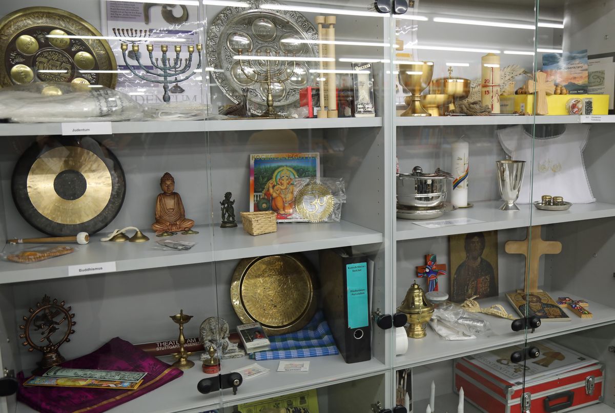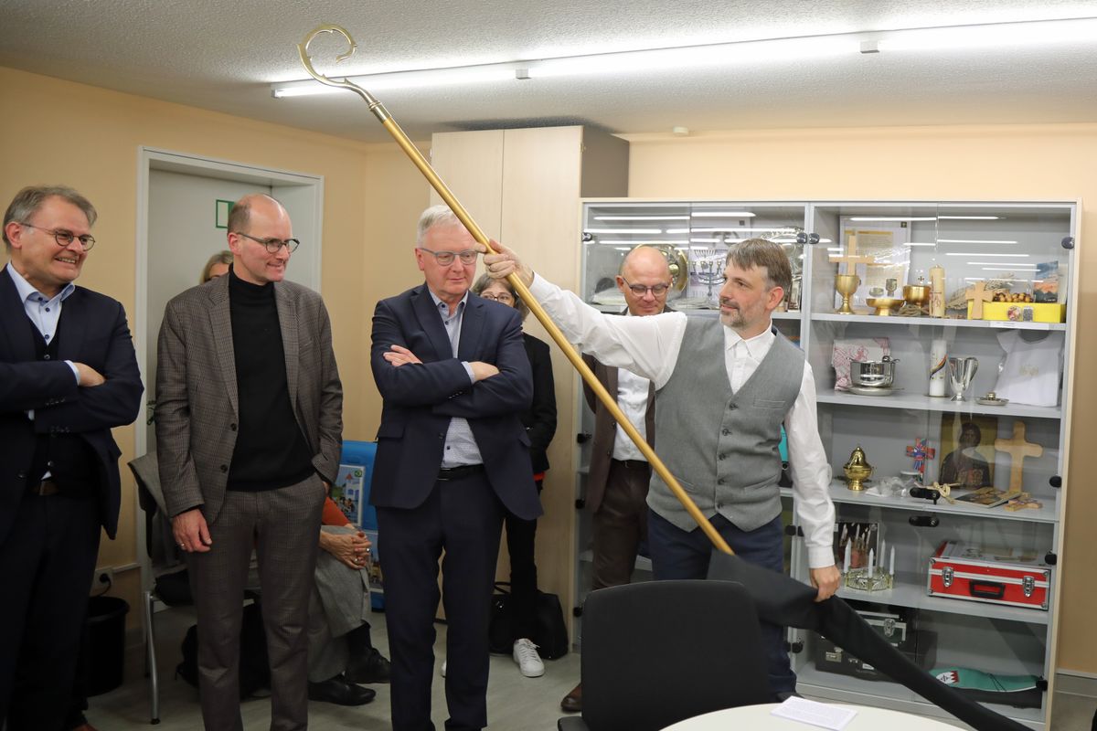 Das RMZ biete Medien für die Praxis an, sagte Ripperger: „Unsere Aufgabe ist es, alle zu betreuen und zu begleiten, die im religionspädagogischen Feld tätig sind.“ Noch seien die Medien aus den unterschiedlichen Einrichtungen getrennt aufgestellt. Sie würden derzeit in einem Katalog zusammengeführt. Dabei gelte es, eine Systematik zu finden, mit der sich alle Zielgruppen zurechtfinden, Ehrenamtliche ebenso wie Studierende. Auch müssten Dubletten aussortiert werden wie auch Medien, die nicht zur Ausrichtung des Medienzentrums passen. Beim Sichten gebe es immer wieder Überraschungen. Als Beispiel zog er aus einer schwarzen Tasche einen gut zwei Meter langen Bischofsstab hervor. Diesen habe er beim Aussortieren alter Landkarten entdeckt, erzählte Ripperger.