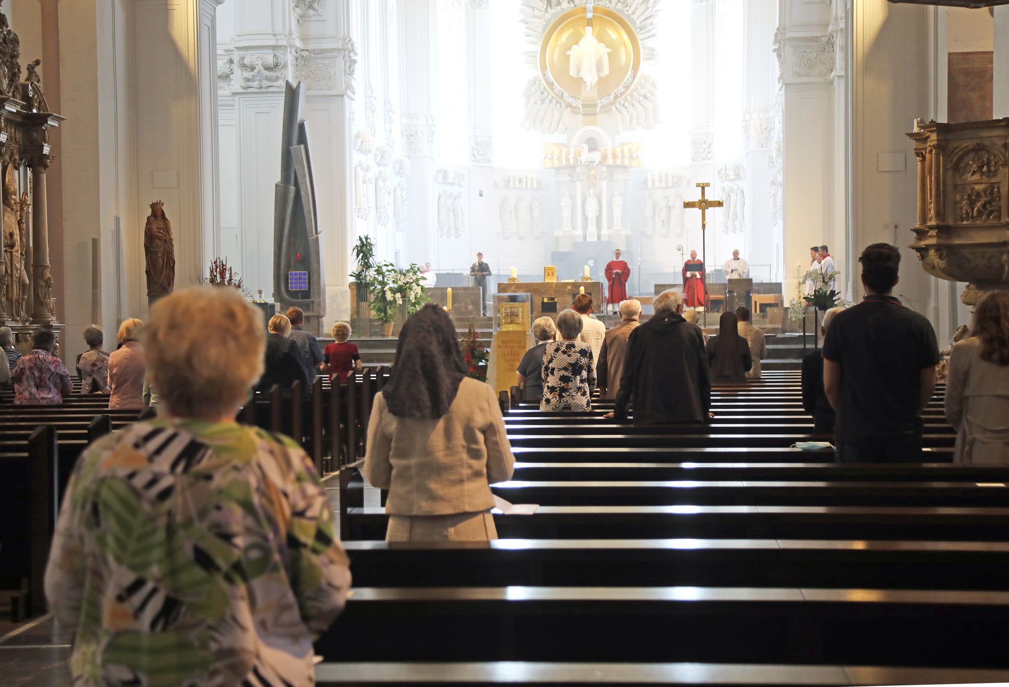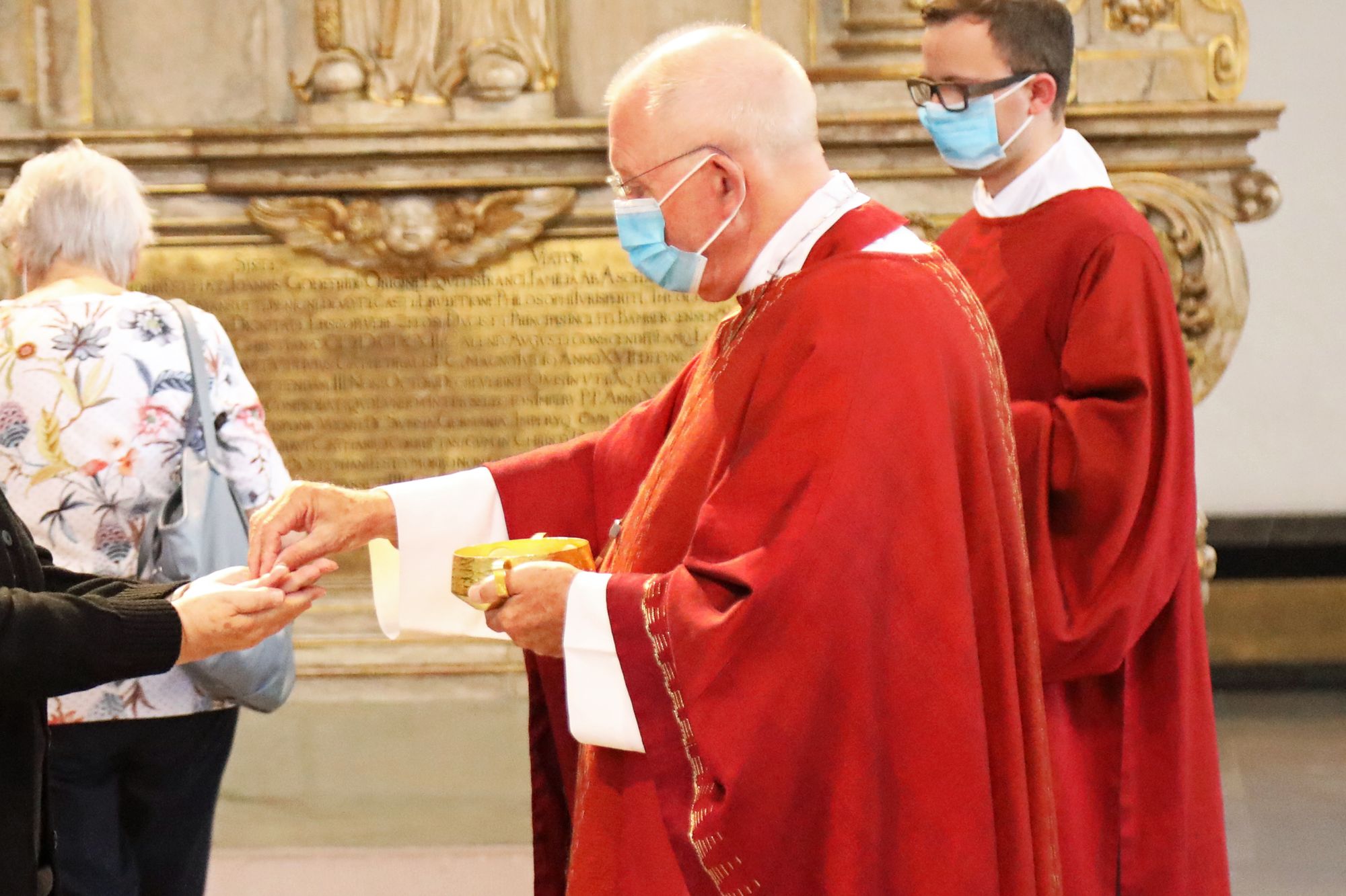 Draußen scheint die Sonne und es weht ein leichter Wind – perfektes Wetter für eine Begegnung. Doch in diesem Jahr bleibt der Kiliansplatz bis auf einige eilig vorbeihastende Passanten leer. Sonst sei sie mit dem Bus zur Kiliani-Wallfahrt gefahren, erzählt eine Frau aus Dipbach (Dekanat Würzburg-rechts des Mains). Auch in diesem Jahr wollte sie nicht auf Kiliani verzichten. „Ich bin lieber an Ort und Stelle. Es war ein schöner Gottesdienst, obwohl er ein bisschen anders abgelaufen ist.“ Es müssten nicht immer viele Menschen sein, stimmt eine andere Frau zu. Ohnehin würden viele die Gottesdienste jetzt im Fernsehen oder Internet ansehen, weiß sie aus ihrem Bekanntenkreis. Auch den Gottesdienst mit Weihbischof Boom haben viele Menschen live im Internet angeschaut. Das mit den Begegnungen sei schon eine gute Sache, „aber es darf nicht ausarten“, erklärt jemand. In manchen Jahren sei es zu voll gewesen, und viele Leute seien vorher nicht einmal im Gottesdienst gewesen. Vermisst wird aber die Gelegenheit für ein Schwätzchen mit Weihbischof Boom oder Bischof Dr. Franz Jung.