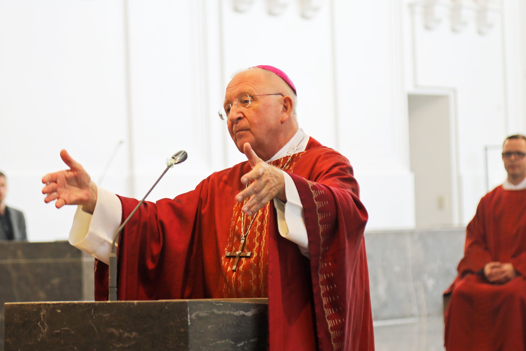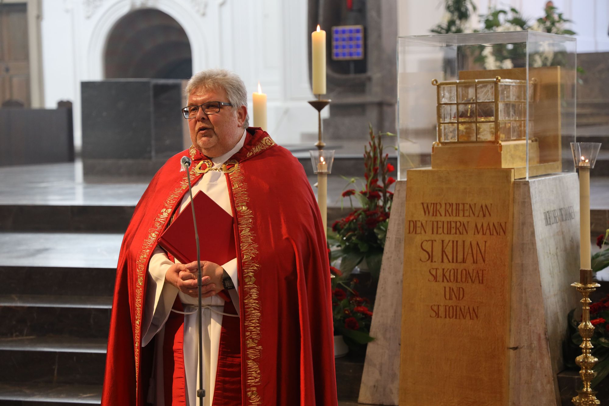 Beim Abendgebet im Kiliansdom thematisiert Domkapitular Monsignore Dietrich Seidel das Thema „Berufung“. Knapp drei Dutzend Gläubige haben sich für das Gebet eingefunden. „Wie die Frankenapostel haben Sie sich heute Abend auf den Weg gemacht, um Christus näher zu kommen“, ruft er den Gläubigen zu. Jesus spreche die Menschen im Alltag an, damit sie sich auf seine Botschaft einlassen. Das mache die Berufung der Jünger im Markusevangelium deutlich. „Ihre bisherigen Fähigkeiten sind für die neue Aufgabe nützlich. Sie sollen Menschenfischer werden, Menschen miteinander vernetzen.“ Jesus nachzufolgen heißt nach den Worten Seidels, von diesem zu lernen, wie man Menschen für Gottes Reich gewinnt. „Jesus beruft Menschen, die bereit sind, auf den Anruf Gottes in ihrer Zeit zu reagieren – so wie einst Kilian, Kolonat und Totnan.“ Die Frohe Botschaft brauche auch heute Menschen, die sich von ihr rufen lassen. „Werden wir zu Musterschülern, im Wissen, dass Berufung eine Lebensaufgabe ist“, sagt Seidel.