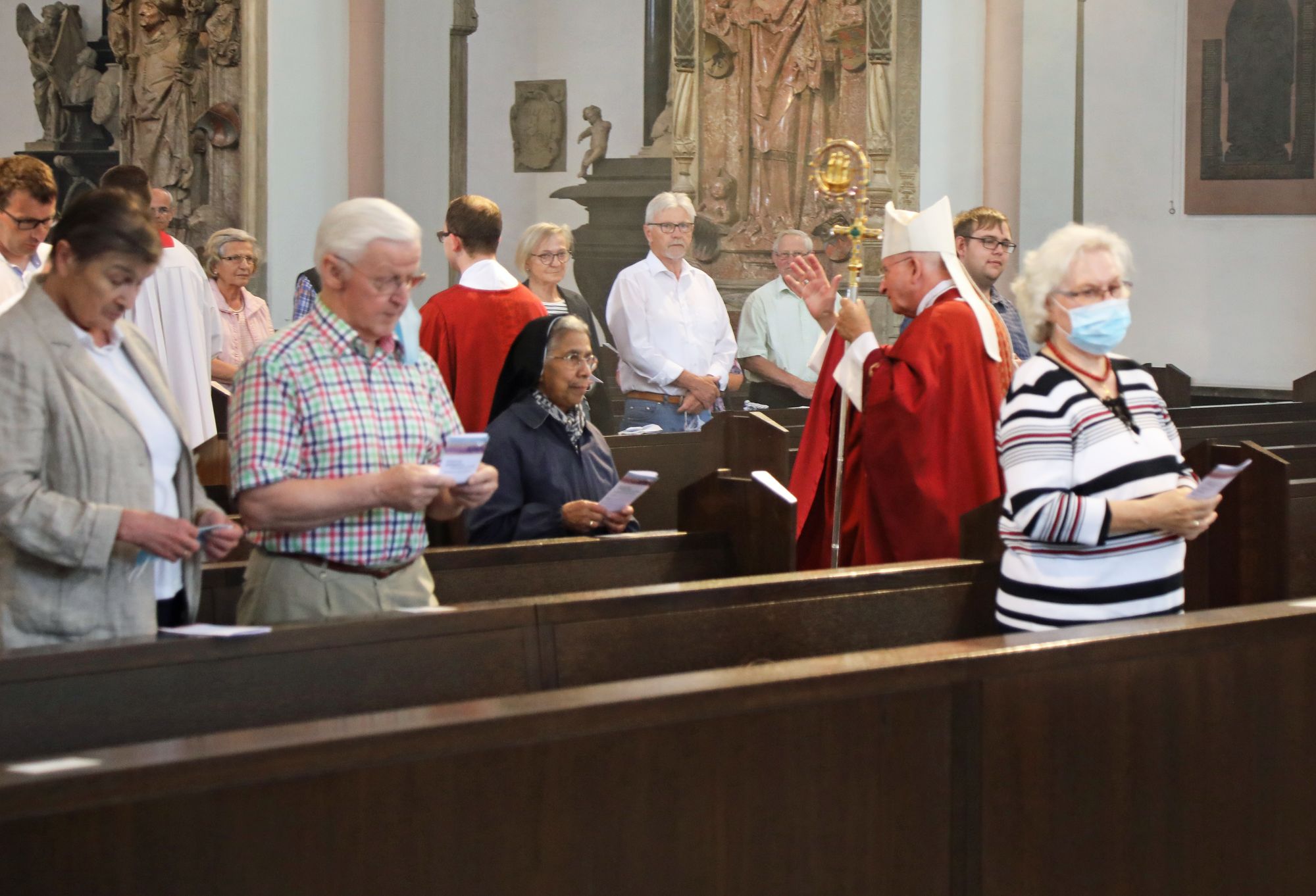 Es ist ein sehr ungewohntes Bild am Montagvormittag, 6. Juli, im Kiliansdom. Wo normalerweise Menschen dicht an dicht sitzen, wirken die Pilger heute in den langen Holzbänken ein wenig verloren. Zettel auf den Rückenlehnen markieren, wo man sich hinsetzen darf und welche Plätze frei bleiben müssen. Die meisten haben den Mund-Nasen-Schutz abgelegt. Doch als die ersten Takte des Kilianslieds auf der Orgel erklingen, singen sie so kräftig mit, als wäre mindestens die vierfache Menge anwesend. Weihbischof Boom begrüßt sie mit einem warmen Lächeln. Eigentlich verbinde man mit dem Kiliani-Fest ja ganz andere Vorstellungen, sagt der Weihbischof. „Aber wenn wir in die über 1000-jährige Geschichte des Gedenkens an die Frankenapostel Kilian, Kolonat und Totnan schauen, dann sehen wir, dass Kiliani oft viel kleiner und bescheidener war.“ Entscheidend sei, „dass wir auf die Frankenapostel schauen und durch sie den Impuls bekommen, wie schön es ist, glauben zu können und die Frohe Botschaft im Herzen zu haben“.