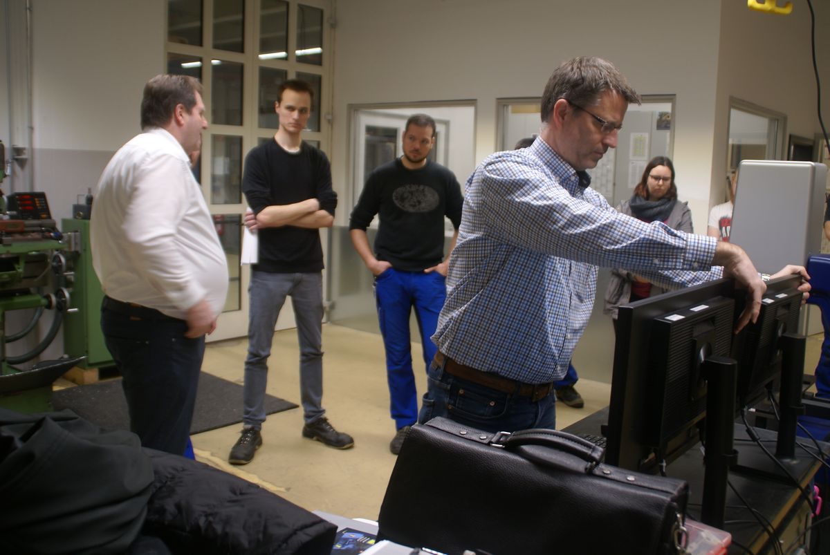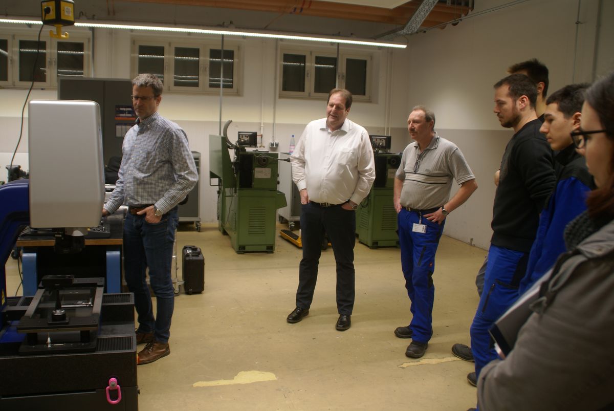 Die Ausbilder Helmut Baier und Benedikt Wohlfart knüpften auf der Messe „Blechexpo“ in Stuttgart Kontakt zum Gießener Meßgeräte-Spezialisten Werth. Dessen Mitarbeiter Joachim Bohnsack und Klaus Müller kamen in die Ausbildungswerkstätten am Schottenanger, um den jungen Leuten vor Ort ein innovatives Multisensor-Koordinatenmessgerät vorzustellen. In ihrer rund einstündigen Präsentation stellten die Experten die Einsatzbereiche und Vorteile der dimensionellen Messtechnik vor. Insbesondere eigne sie sich für das Messen großvolumiger Werkstücke aus verschiedenen Ansichten. „Wir freuen uns, wenn wir unsere tägliche Ausbildung mit externen Referenten bereichern können und unsere Auszubildenden so einen realistischen Einblick in die berufliche Praxis erhalten“, betonen die Ausbilder Baier und Wohlfart. Die rund 18 angehenden Zerspanungsmechaniker zeigten sich sehr interessiert an der Präsentation der beiden Gäste. Möglicherweise gibt es im Oktober 2021 für alle Beteiligten ein Wiedersehen: Dann steht für die Auszubildenden die Exkursion zur 15. internationalen Fachmesse für Blechbearbeitung – die „Blechexpo“ – nach Stuttgart an.