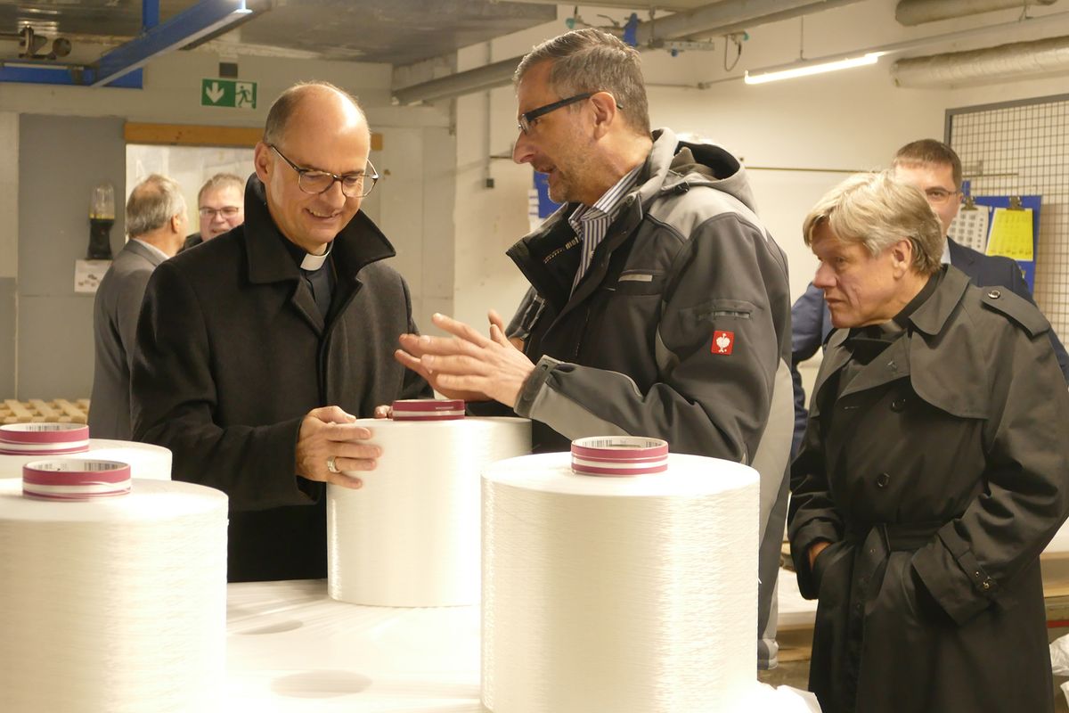 Zwischen den Gesprächen führte Thomas Rasch, Betriebsleiter der Firma PHP Fiber, die Besucher durch eine der Produktionshallen, in denen Garn aus Kunststoff hergestellt und verpackt wird. Die dünnen, aber sehr stabilen Schnüre werden für Verstärkungsnetze zum Beispiel in Reifen und Gartenschläuchen oder für die Produktion von Airbags verwendet. Rund 40.000 Kilometer Garn werden hier in einem Jahr auf Spulen gepackt und dann in die Welt verschickt. Bischof Jung ließ sich beim Rundgang auch die Maßnahmen für Arbeitssicherheit und Gesundheitsschutz erklären.